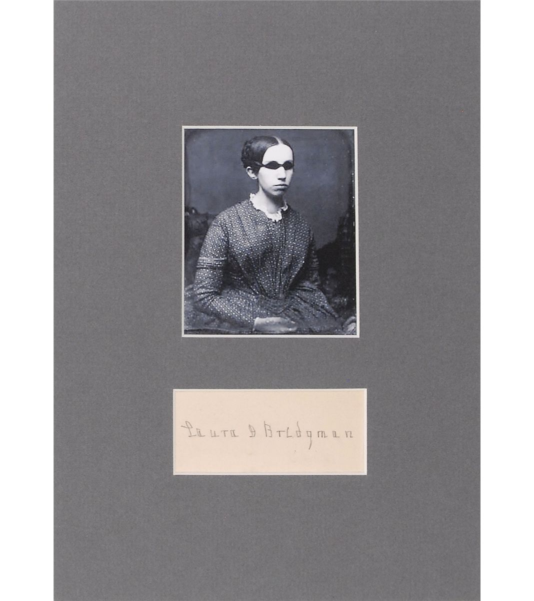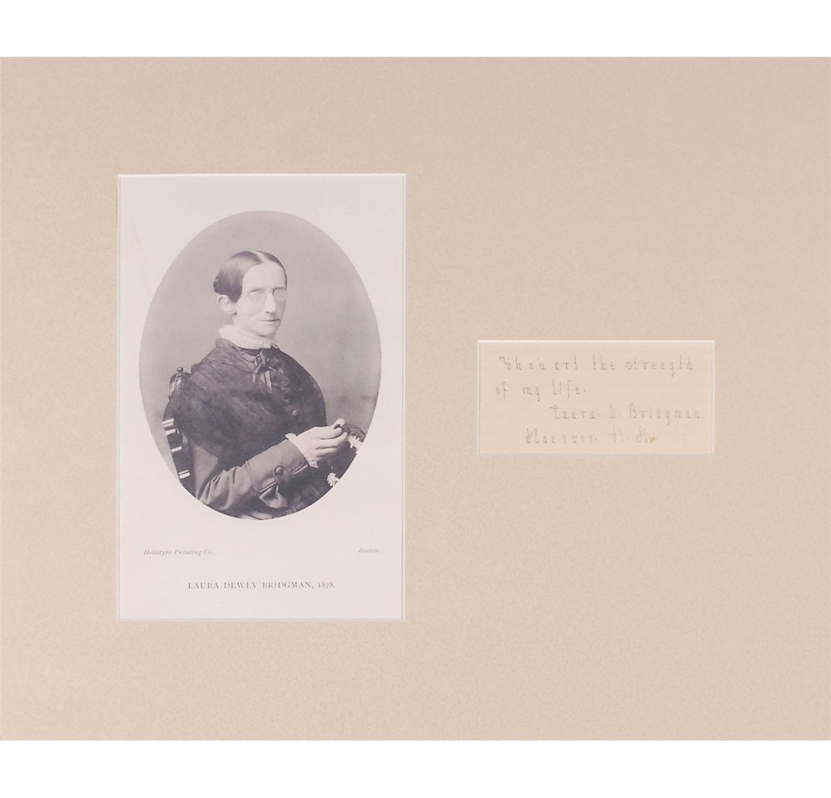 AQS in pencil, “Thou art the strength of my life. Laura D. Bridgman, Hanover, NH,” on an off-white 4.75 x 2.25 lightly-lined slip, matted with an image to an overall size of 17 x 14; and a pencil signature, “Laura D. Bridgman,” on an off-white 3.5 x 1.5 slip, matted with an image to an overall size of 8 x 11. In fine condition.