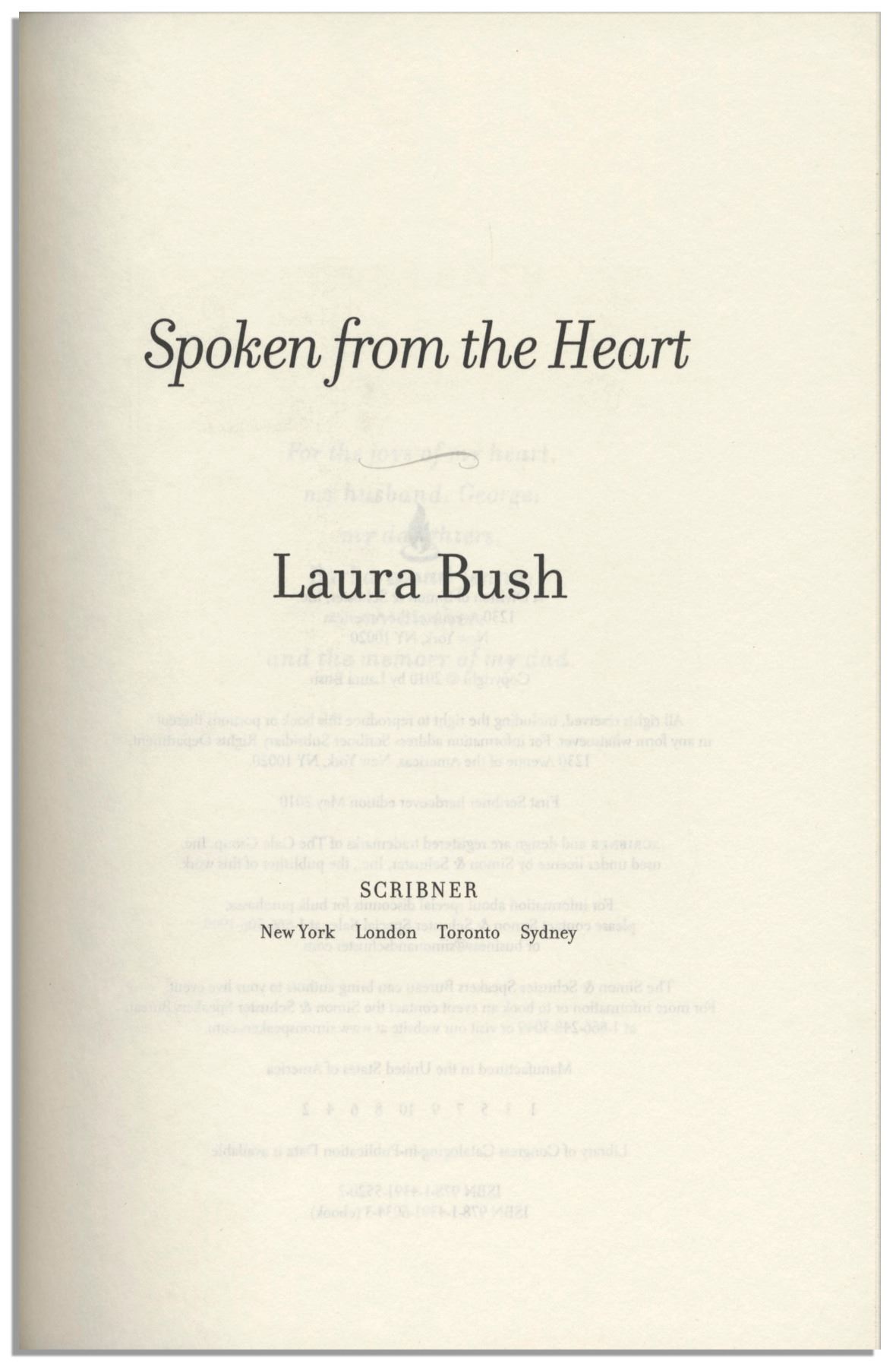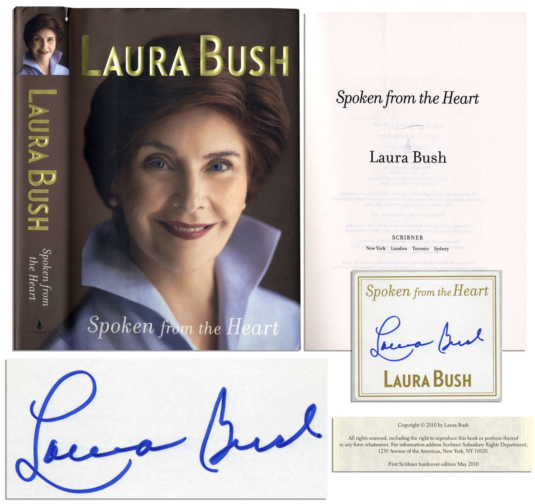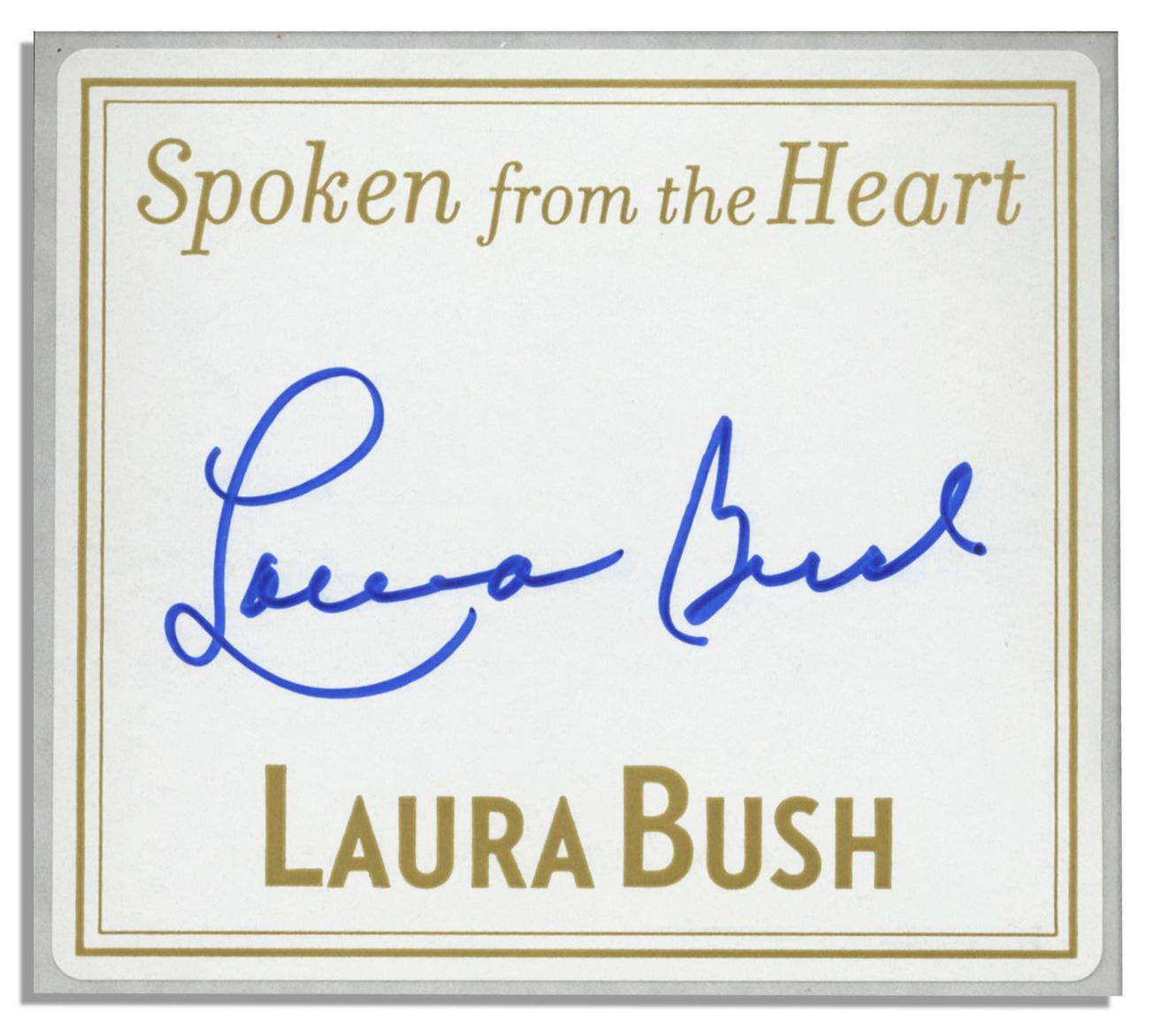 Laura Bush signed official bookplate for ''Spoken From the Heart'', along with the memoir itself. Scribner's: New York: 2010. Bookplate to accompany the First Lady's memoir is not affixed and comes with original wax paper backing. Measures 4'' x 3.5''. Fine. Lauded for her candor, Laura Bush shares her personal life in this 456pp. memoir which measures 6.5'' x 9.5''. Bound in blue paper boards with a blue cloth spine and gilt lettering. Fine condition. Dust jacket is near fine.