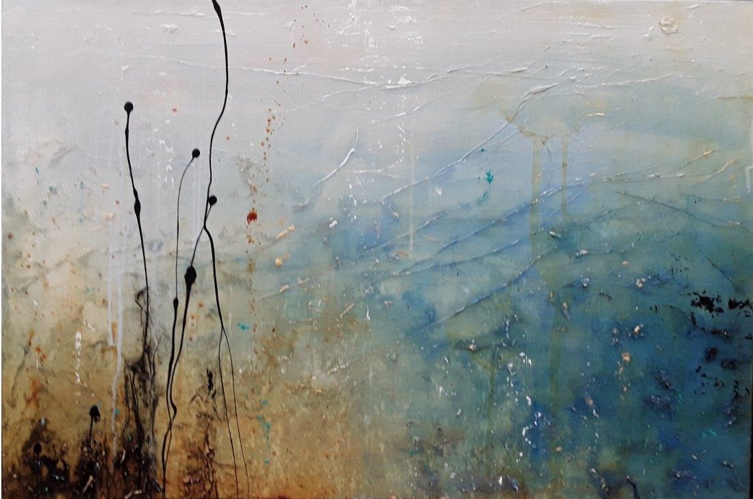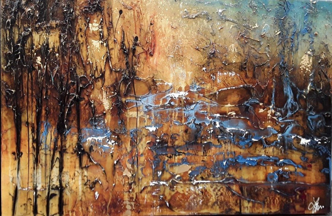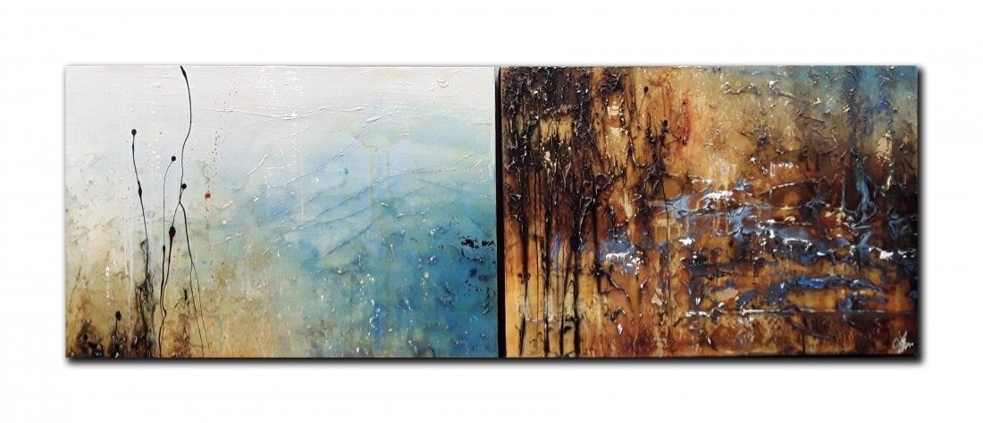 Laura Harris's 'Their Time To Go' original mixed media on canvas paintings. This is a 2 piece set. These are abstract style paintings that Laura Harris has made into a set. The texturization Laura Harris has done with these two pieces is incredible. 24" x 36" ; 24" x 36"