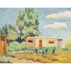 Laura Hoernig (American, 20th century), “Adobe”, c.1940; oil/canvas laid down on board, 8” x 10”, unsigned. Hoernig was a Kansas City painter, but also worked in Taos, New Mexico. Provenance: the estate of the artist.