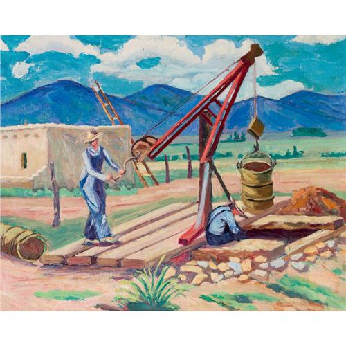 Laura Hoernig (American, 20th century), "Workers in New Mexico", c.1940; oil/canvas , 16" x 20", unsigned. Hoernig was a Kansas City painter, but also worked in Taos, New Mexico. Provenance: the estate of the artist.