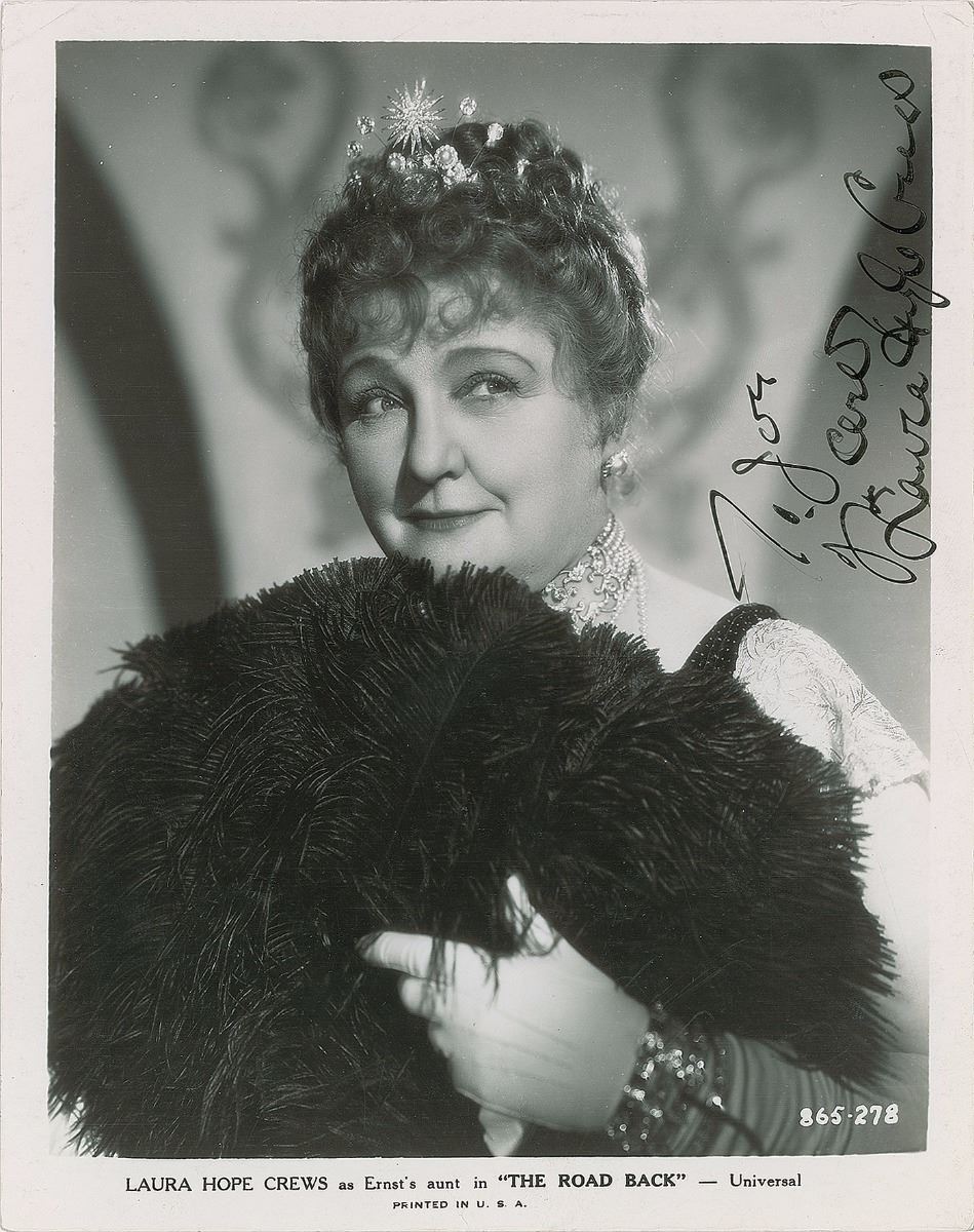 American stage and film actress (1879–1942) best known for her role as Aunt Pittypat in Gone With the Wind. Vintage glossy 8 x 10 Universal Pictures publicity photo of Crews as Ernst's Aunt in the 1937 film The Road Back, vertically signed and inscribed in fountain pen, “To Jon…Laura Hope Crews.” Reverse bears a Culver Service photography stamp and label. In fine condition.