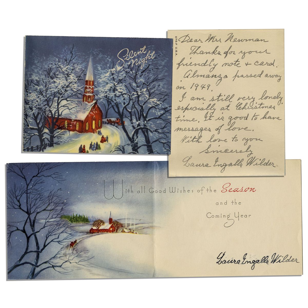 Author of the beloved ''Little House on the Prairie'' series Laura Ingalls Wilder autograph letter signed and additional signature. ALS appears on the back of a Christmas card signed. Both printed sentiment and autograph letter are signed in her full married name, ''Laura Ingalls Wilder''. Letter to verso reads in full, ''Dear Mrs. Newman, Thanks for your friendly note + card. Almanzo passed away in 1949. I am still very lonely, especially at Christmas time. It is good to have messages of love. With love to you / Sincerely, Laura Ingalls Wilder''. Letter runs 1pp., on verso of greeting card with ''Silent Night'' country church scene illustrated in color on the front. Measures 4'' x 5''. Light toning and showthrough of another signature to signed card greeting, else near fine. With PSA/DNA COA.