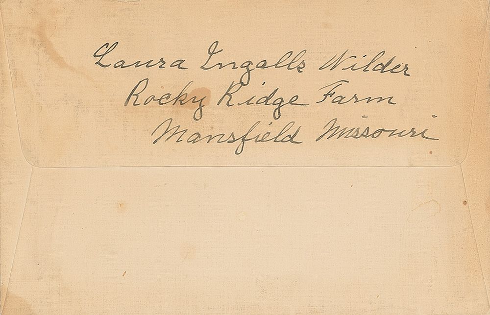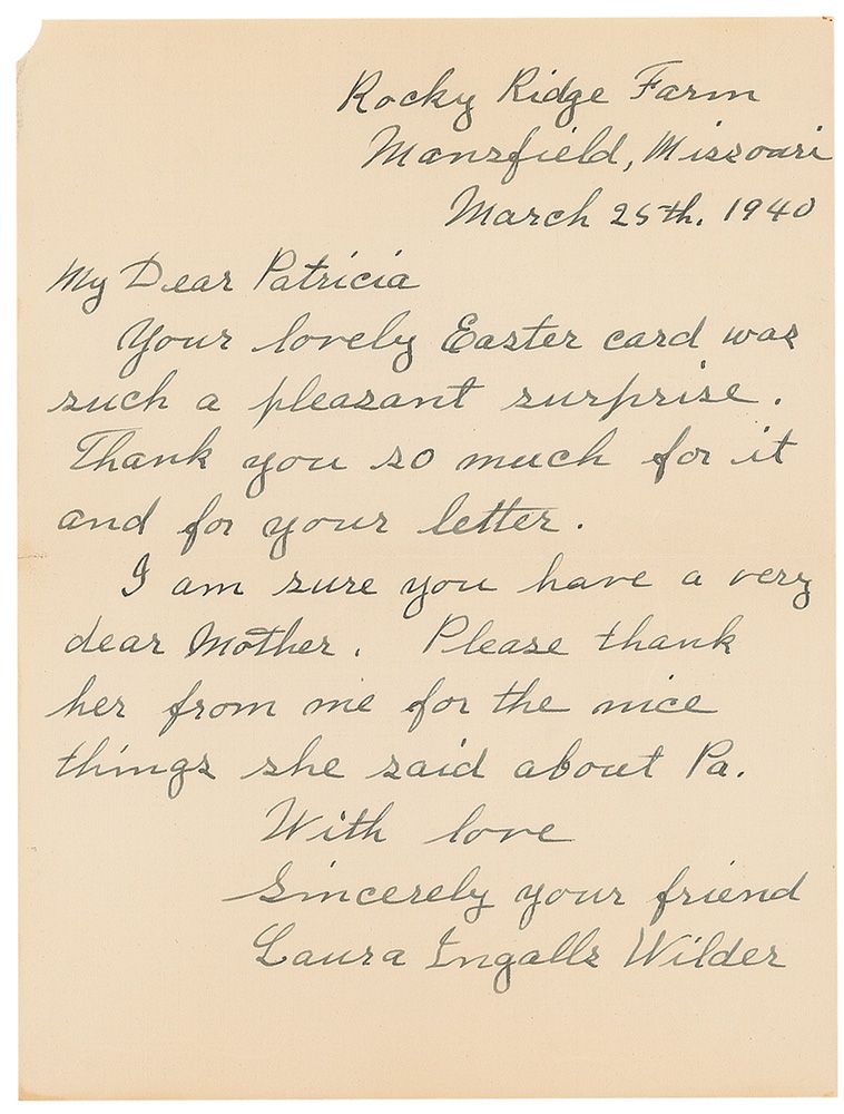 Author (1867–1957) famous for writing Little House on the Prairie. Scarce ALS, one page, 5.5 x 7.25, Rocky Ridge Farm, Mansfield, Missouri, March 25, 1940. Letter to Patricia Newman. In full: “Your lovely Easter card was such a pleasant surprise. Thank you so much for it and for your letter. I am sure you have a very dear mother. Please thank her from me for the nice things she said about Pa.” In fine condition, with mild toning and slight paper loss to upper left corner. Accompanied by the original mailing envelope, filled out in Wilder’s hand and signed again in the return address area.