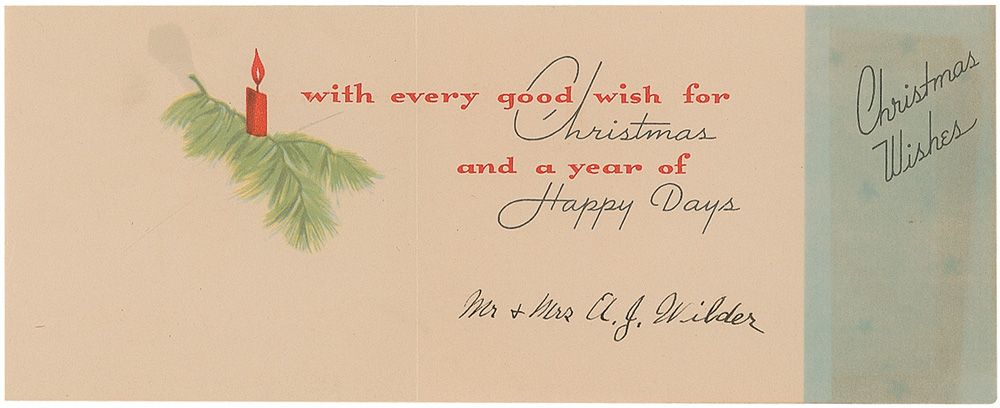 Christmas card, measuring 5.5 x 4 closed, bearing an image of a candle on the front and a printed message inside, signed inside in black ink by Wilder, “Mr. & Mrs. A. J. Wilder.” In fine condition, with a couple light blocks of toning.