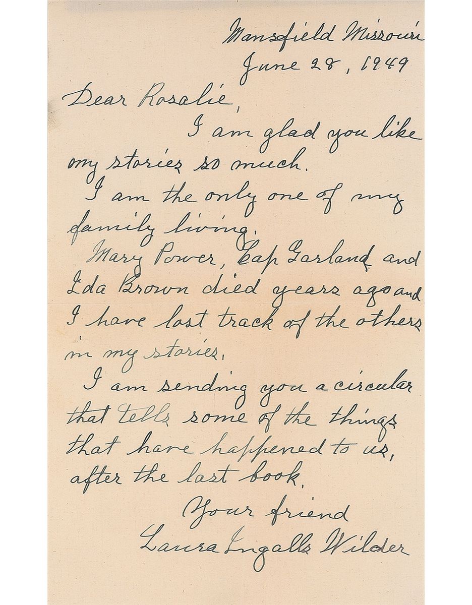 Author (1867–1957) famous for writing Little House on the Prairie. Uncommon ALS, one page, 5 x 8, June 28, 1949. Letter to an admirer. In part: “I am glad you like my stories so much. I am the only one of my family living. Mary Power, Cap Garland and Ida Brown died years ago and I have lost track of the others in my stories.” In fine condition, with central horizontal and vertical folds, one through a single letter of signature, and some light wrinkling and creasing. Accompanied by the original mailing envelope.
