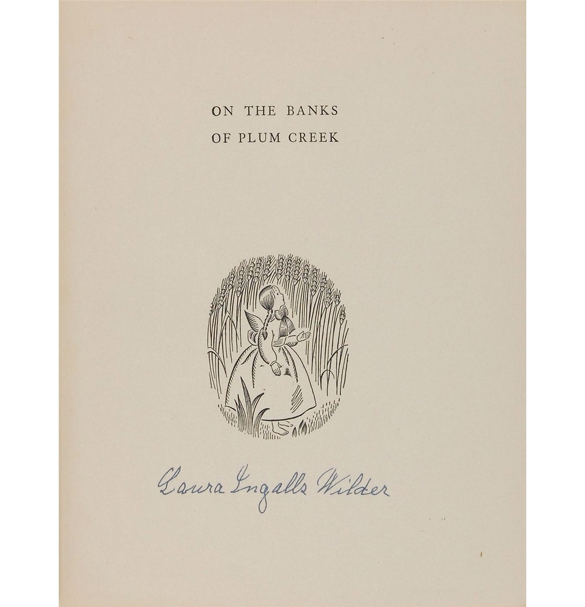 Rare signed book: On the Banks of Plum Creek. Later printing. NY: Harper & Brothers Publishers, 1937. Hardcover with dust jacket, 7 x 8.5, 239 pages. Signed on the half-title page in fountain pen, “Laura Ingalls Wilder.” Autographic condition: fine, with subtle feathering to ink. Book condition: VG-/G+. Inspired by her childhood, the story follows the Ingalls family as they travel by covered wagon to Minnesota and settle in a dugout on the banks of Plum Creek. This was the fourth book in her enduring Little House series, the immediate successor to her most famous work, Little House on the Prairie. In addition to the innate desirability of novels from this historically important series, books signed by Wilder are excessively rare—this is the first we have offered.