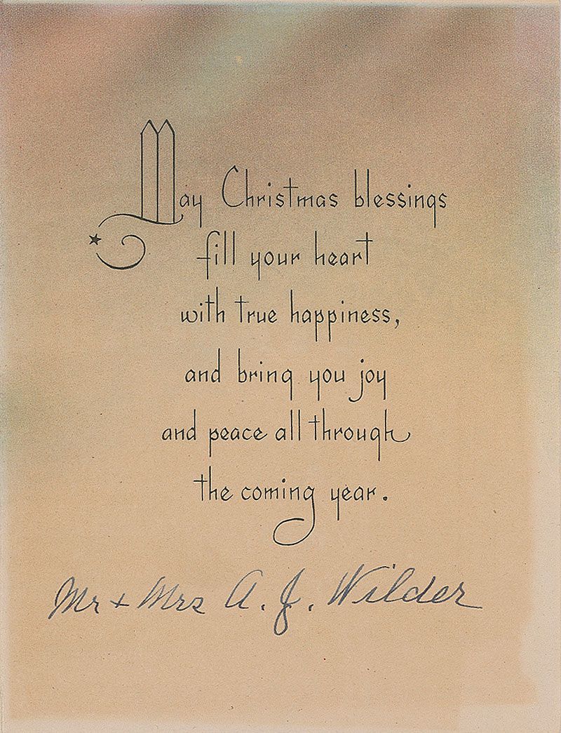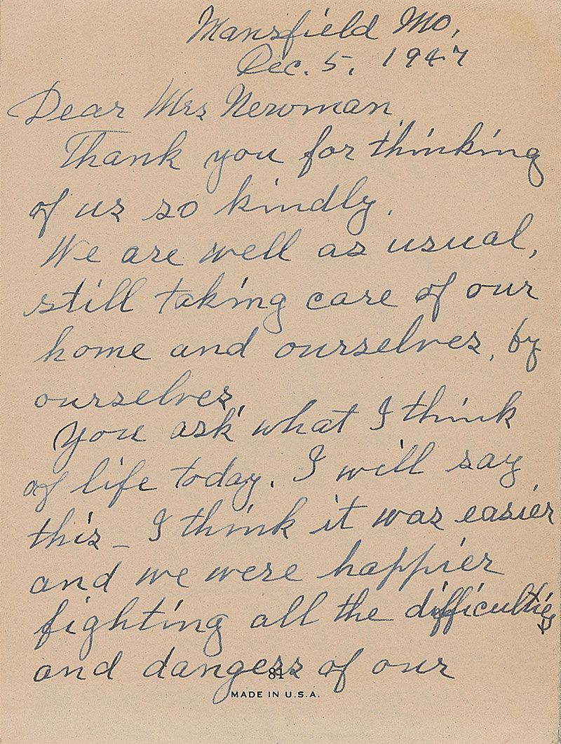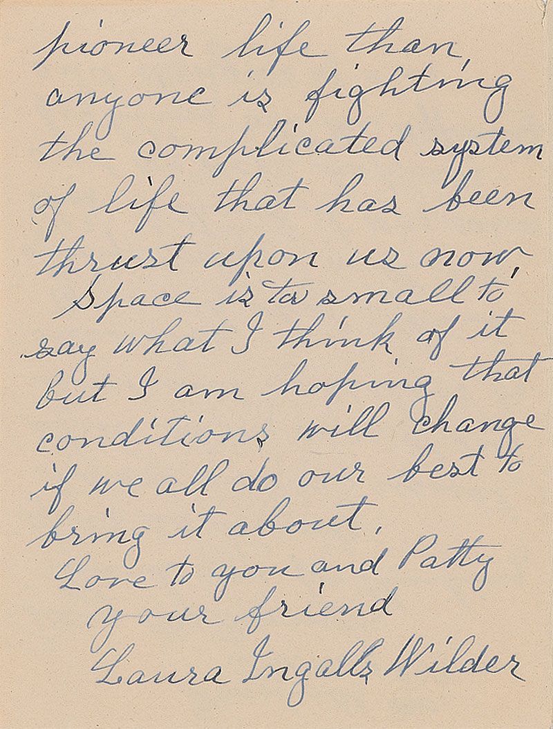ALS signed “Laura Ingalls Wilder,” two pages on the reverse and inner panel of a Christmas card depicting the Magi traveling toward Bethlehem, 3.75 x 5, December 5, 1947. In full: “You ask what I think of life today. I will say this—I think it was easier and we were happier fighting all the difficulties and dangers of our pioneer life than anyone is fighting the complicated system of life that has been thrust upon us now. Space is too small to say what I think of it but I am hoping that conditions will change if we all do our best to bring it about.” The Christmas card is also signed below the printed sentiment by Laura, “Mr. & Mrs. A. J. Wilder.” In fine condition. Wilder based her enduring Little House series on her own experiences growing up in a pioneer family; her books and their screen adaptations have inspired within following generations a similar sense of nostalgia for the pioneer life, as she expresses here. Wilder is scarce in any form, and the excellent content and condition of this piece make it a particularly remarkable example.