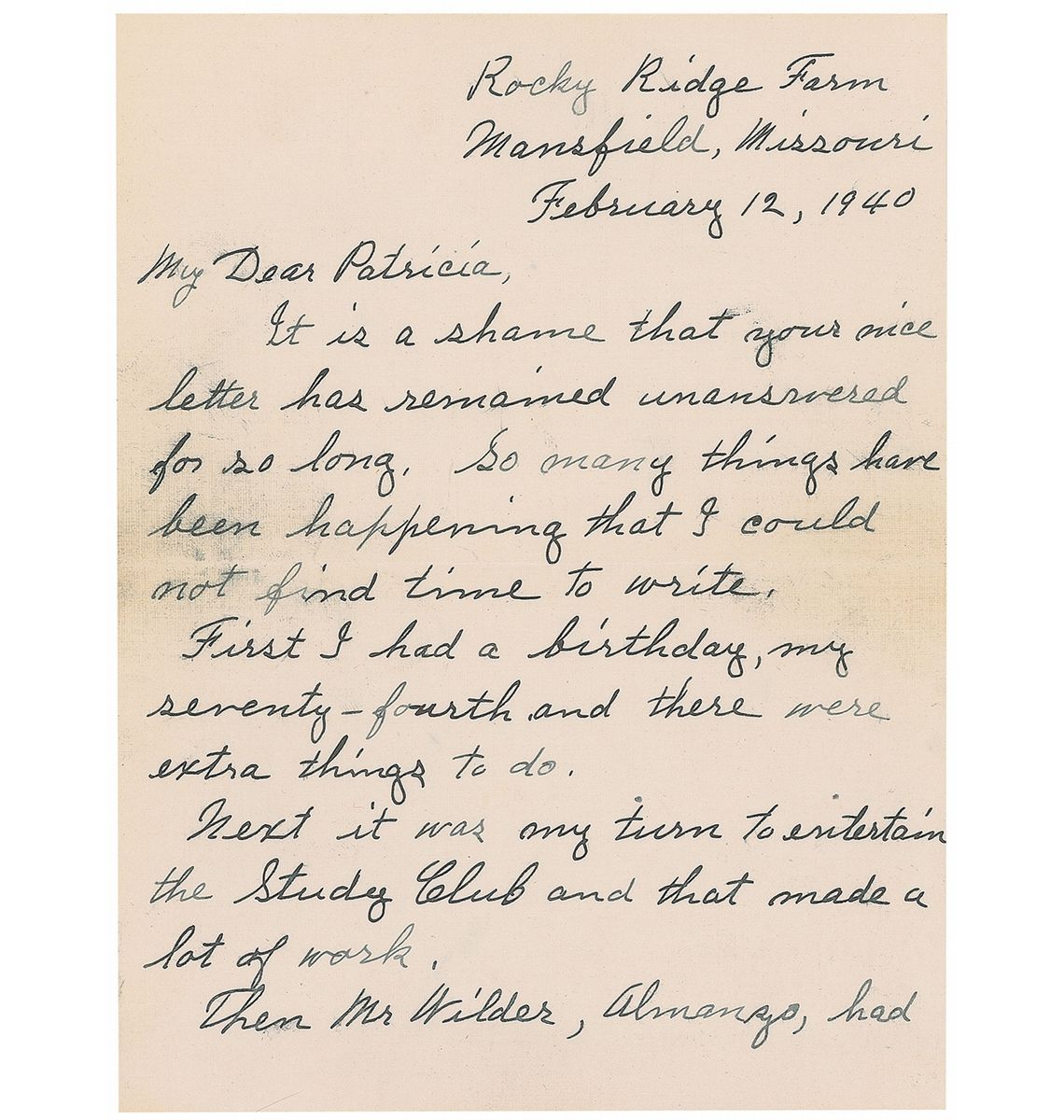 Scarce ALS, three pages on two sheets, 5.5 x 7, February 12, 1940. Letter to an admirer. In part: “I’m glad you like my books and you are right, I am Laura. It would not be surprising if someday you should write even better than I have. A girl who writes such a delightful letter will be able to write stories. It pleases me that Pa’s fiddle should be so real to you. I have it now, for Pa died years ago. Ma and Mary are gone too. Grace married and is still living not far from De Smet. Carrie married and is a widow now…I married Almanzo and we have lived together for more than fifty years.” She adds a handwritten postscript at the conclusion, signed “L. I. W.,” in full: “P.S. I am writing another book for next year.” In fine condition, with some light brushing to ink throughout. In 1941 Wilder published Little Town on the Prairie, the seventh book in the Little House series, which takes place in De Smet, South Dakota. She also mentions “Pa’s fiddle,” an important relic from her childhood that appears frequently in the Little House series. An exceptionally desirable letter with several references to her life and her literature.