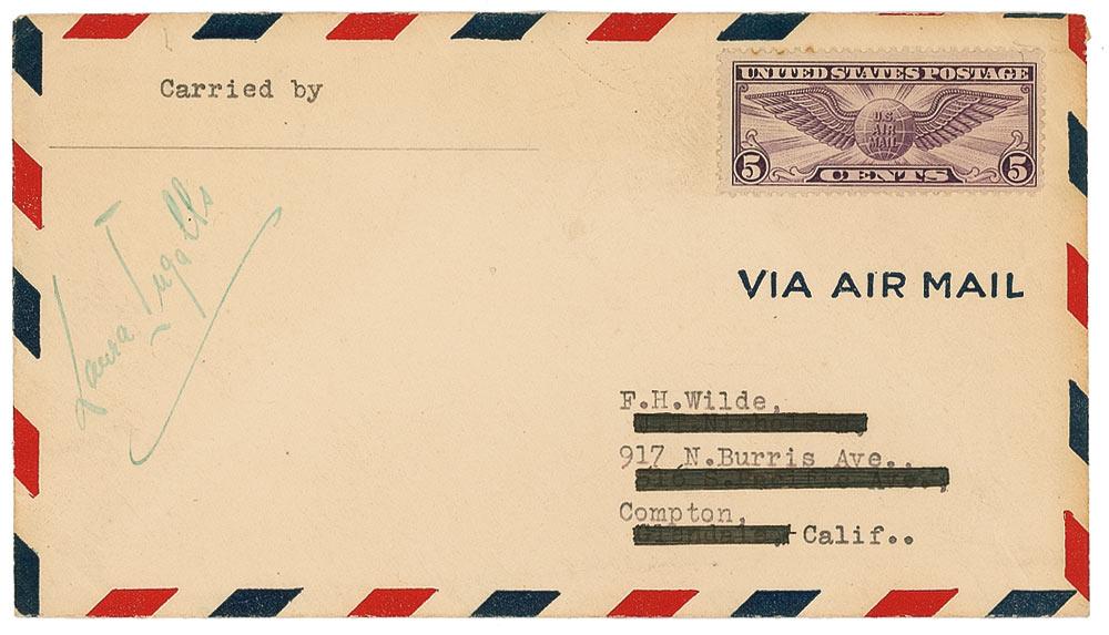 American aviatrix (1901–1967) who set a number of notable aviation records in the 1930s. Accused of being a spy under the provisions of the 1938 Foreign Agents Registration Act, she was jailed for more than a year in 1942–43. Despite the support of such notables as Eddie Rickenbacker, Ingalls was never pardoned. Two flight-flown air mail envelopes, 6.5 x 3.5, both carried by Ingalls with one bearing a typed notation that it was carried on her transcontinental flight from California to New Jersey. Both signed in ink along the left edge. In fine condition, with faint toning and light soiling.