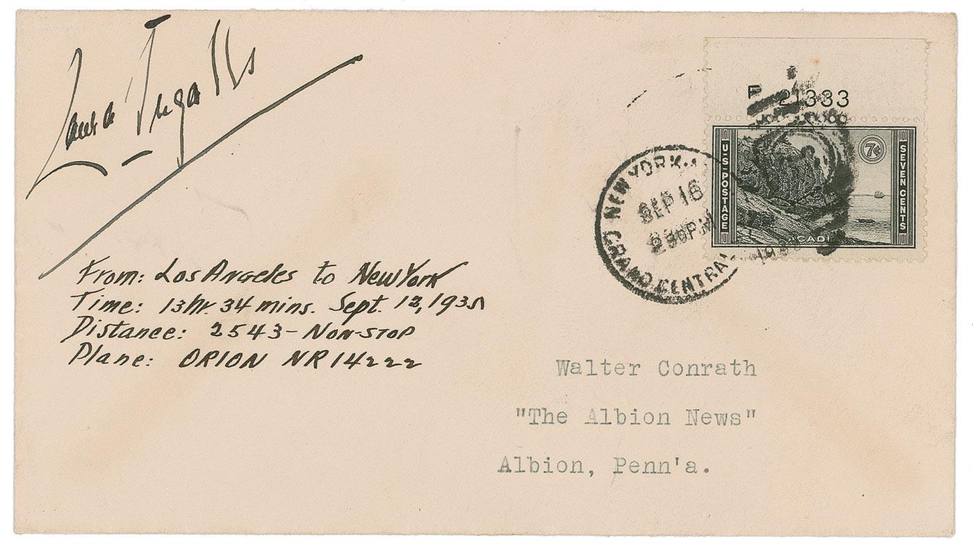 American aviatrix (1901–1967) who set a number of notable aviation records in the 1930s. Accused of being a spy under the provisions of the 1938 Foreign Agents Registration Act, she was jailed for more than a year in 1942–43. Despite the support of such notables as Eddie Rickenbacker, Ingalls was never pardoned. Mailing envelope, 6.5 x 3.75, addressed in type to Walter Conrath of the Albion News, signed in black ink in the upper left corner, “Laura Ingalls.” Underneath her signature is written: “From: Los Angeles to New York; Time 13 hr. 34 mins. Sept 12, 1935; Distance: 2543 - Non-stop; Plane: Orion NR14222.” Envelope also bears a September 16, New York, postmark. In fine condition, with a uniform shade of toning, and a bit of trivial soiling.