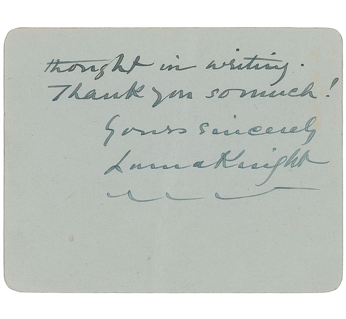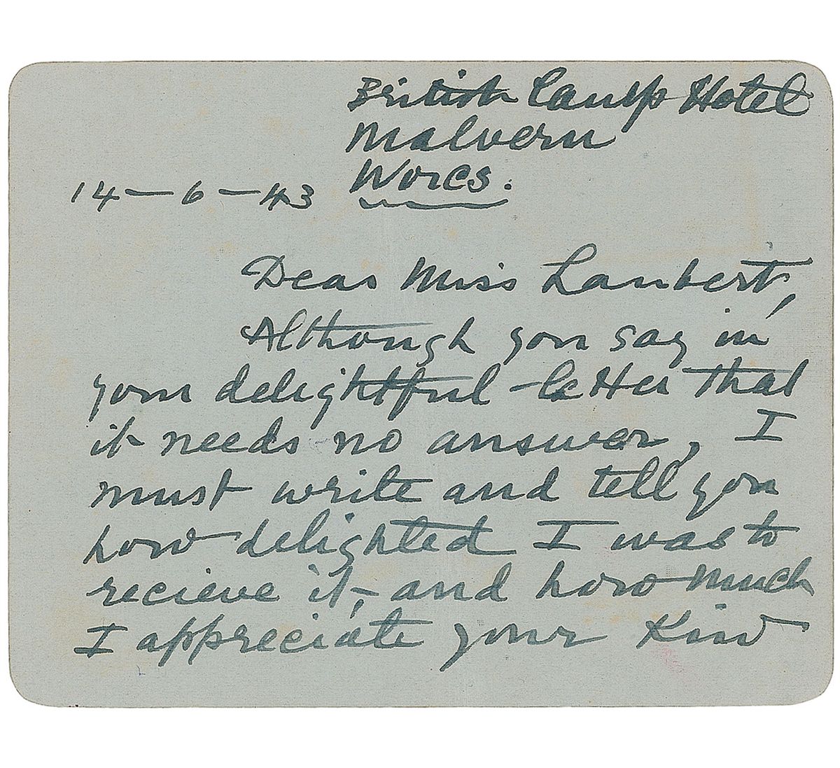 British artist (1877–1970) known as a painter in the figurative, realist tradition who embraced English Impressionism. ALS, one page both sides, 4.5 x 3.5, June 14, 1943. Letter to Miss Lambert. In part: “Although you say in your delightful letter that it needs no answer, I must write and tell you how delighted I was to receive it and how much I appreciate your kind thought in writing.” Vertical crease to the center, otherwise fine condition. Accompanied by a postcard showing one of her paintings.