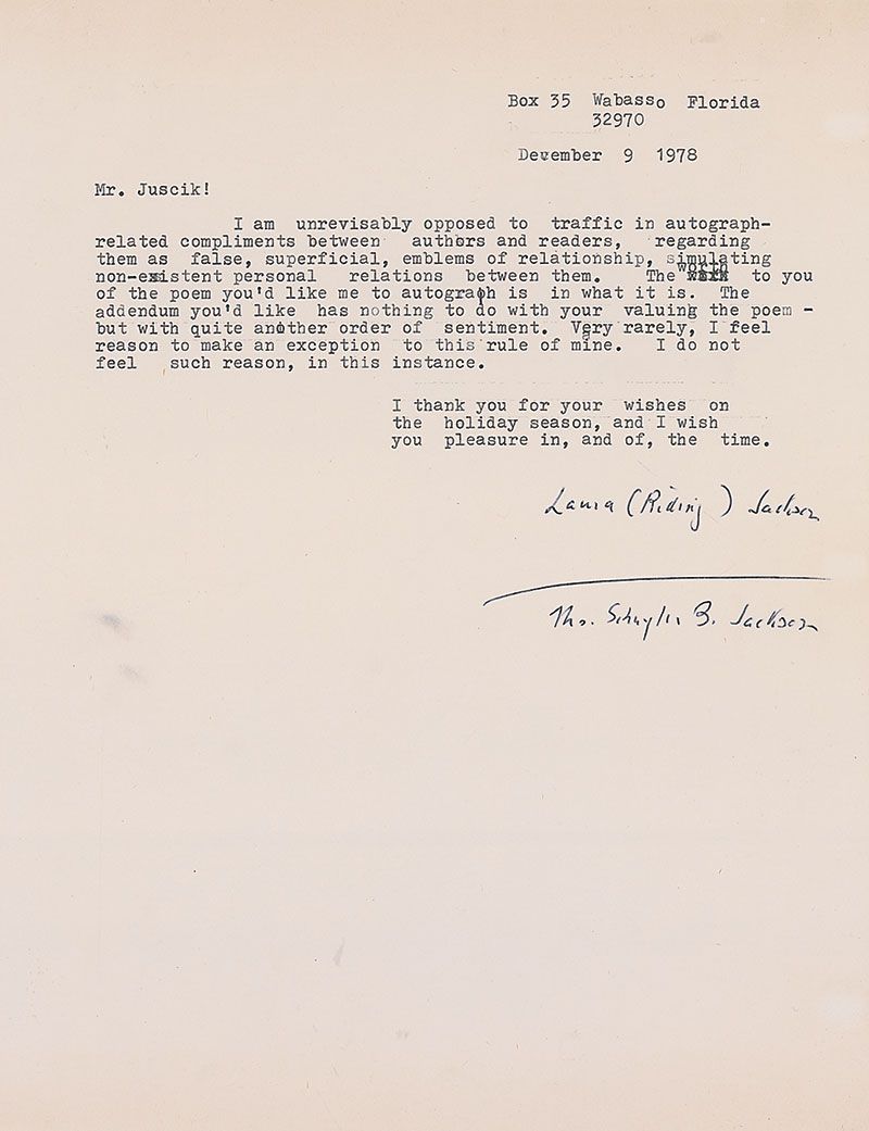 American writer (1901–1991) known for her association with Robert Graves. Scarce TLS signed “Laura (Riding) Jackson, Mrs. Schuyler B. Jackson,” one page, 8.5 x 11, December 9, 1978. Response to an autograph seeker. In part: “I am unrevisably opposed to traffic in autograph-related compliments between authors and their readers, regarding them as false, superficial, emblems of relationship, simulating non-existent personal relations between them…Very rarely, I feel reason to make an exception to this rule of mine. I do not feel such reason, in this instance.” In fine condition.