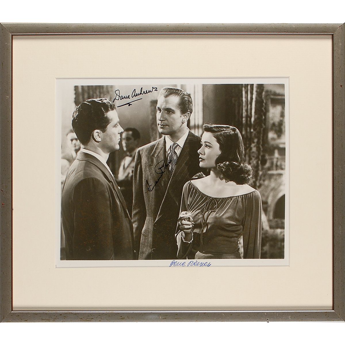 Glossy 10 x 8 photo from Laura, signed in black felt tip by Dana Andrews and Vincent Price, and in blue felt tip by Gene Tierney. Matted and framed to an overall size of 14.25 x 12.5. In very good condition, with scattered golding to lower portion of image.