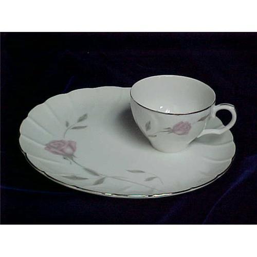 Soft pink rose, grey accents, platinum edging creates an elegant tone for dessert, formal luncheon, or late night dining. Mint condition. 4 plates. 4 cups. Made by Laurel China of Japan.