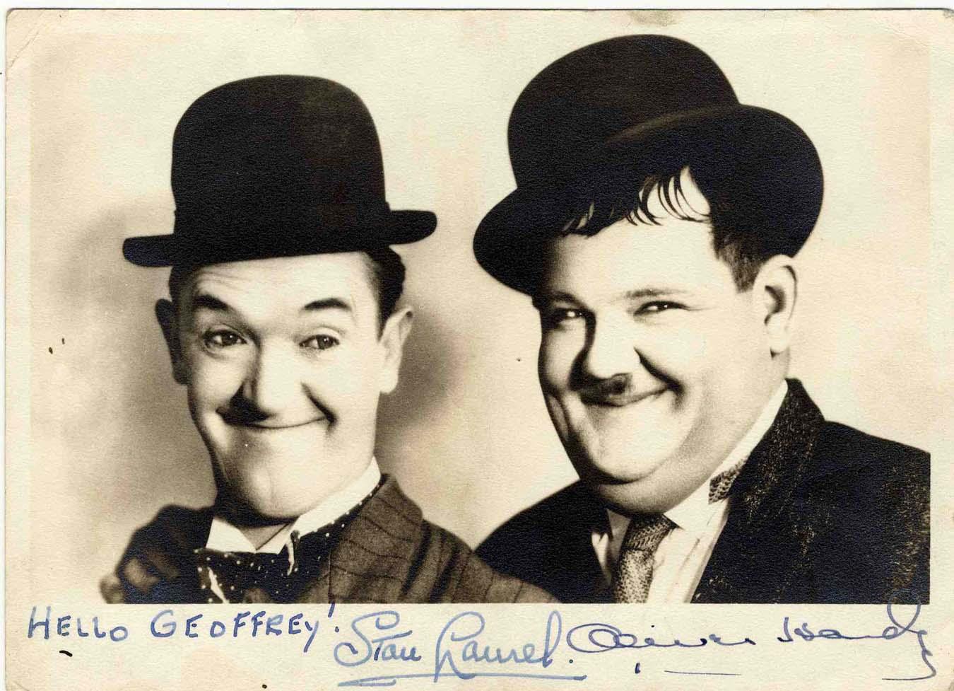Nice signed photo of the comedic duo Oliver & Hardy. Inscribed ''HELLO GEOFFREY!'' and signed ''Stan Laurel. Oliver Hardy''. Nice contrast of signatures written in blue ink on photo measuring 7'' x 5''. Sepia photo is creased at corners, else near fine.
