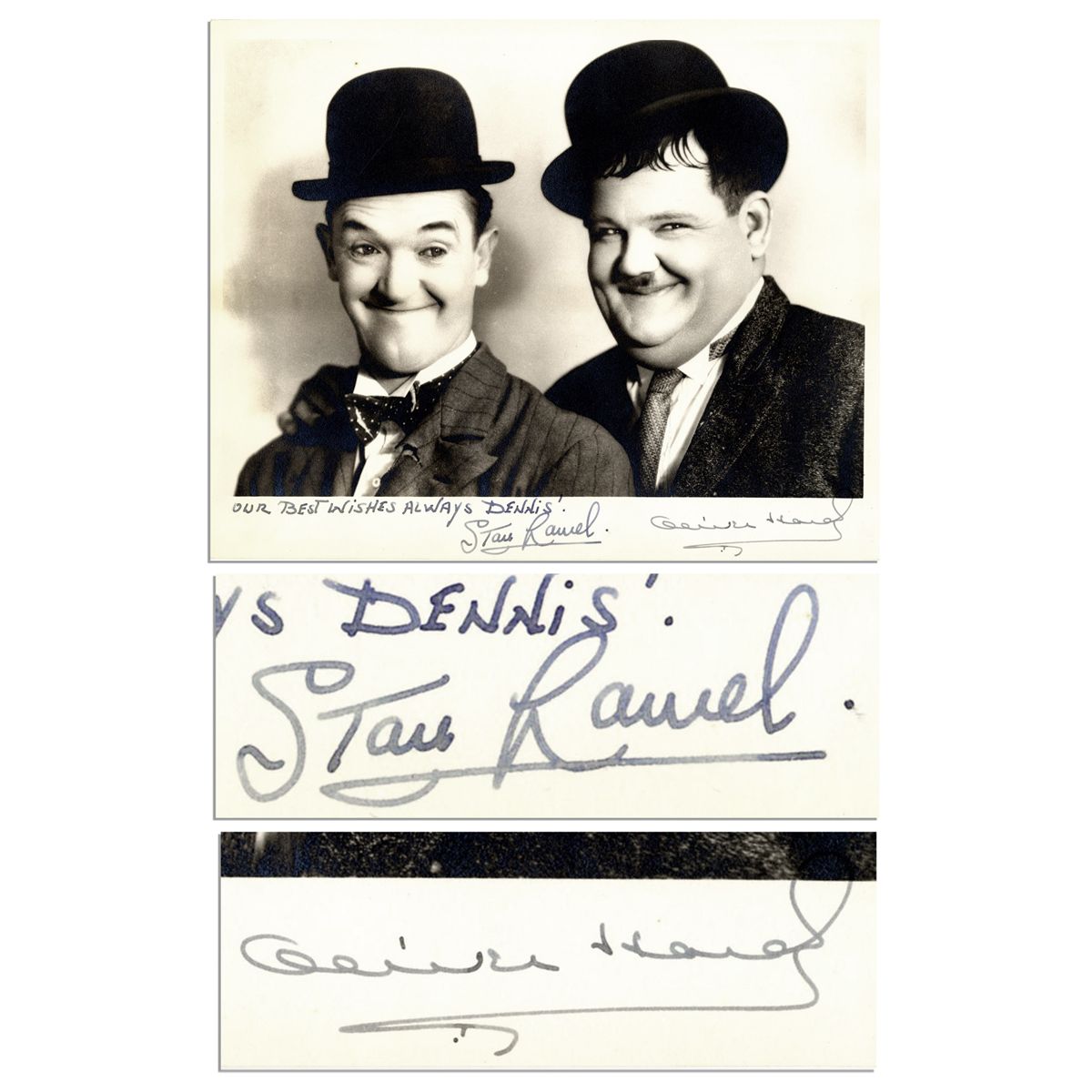 Photo signed ''Stan Laurel'' and ''Oliver Hardy'' by the original Hollywood comedy pair. Laurel additionally inscribes, ''Our best wishes always Dennis!'' Both performers sport mischievous grins and Derby hats. Measures 10'' x 8''. Matte-finish photo has adhesive remnants to verso, else fine.