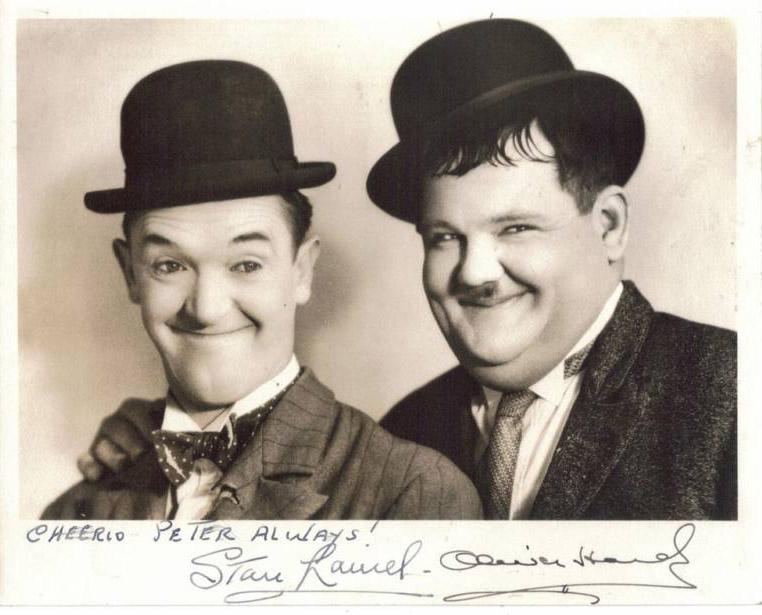 Autographed Laurel and Hardy black and white photo of ''The Boys'' in their trademark hats. One of the greatest comedy teams on the silver screen, they inscribed at the bottom, ''Cheerio Peter Always / Stan Laurel / Oliver Hardy''. The 8.5'' x 5.5'' photo has minor stains, otherwise near fine condition.