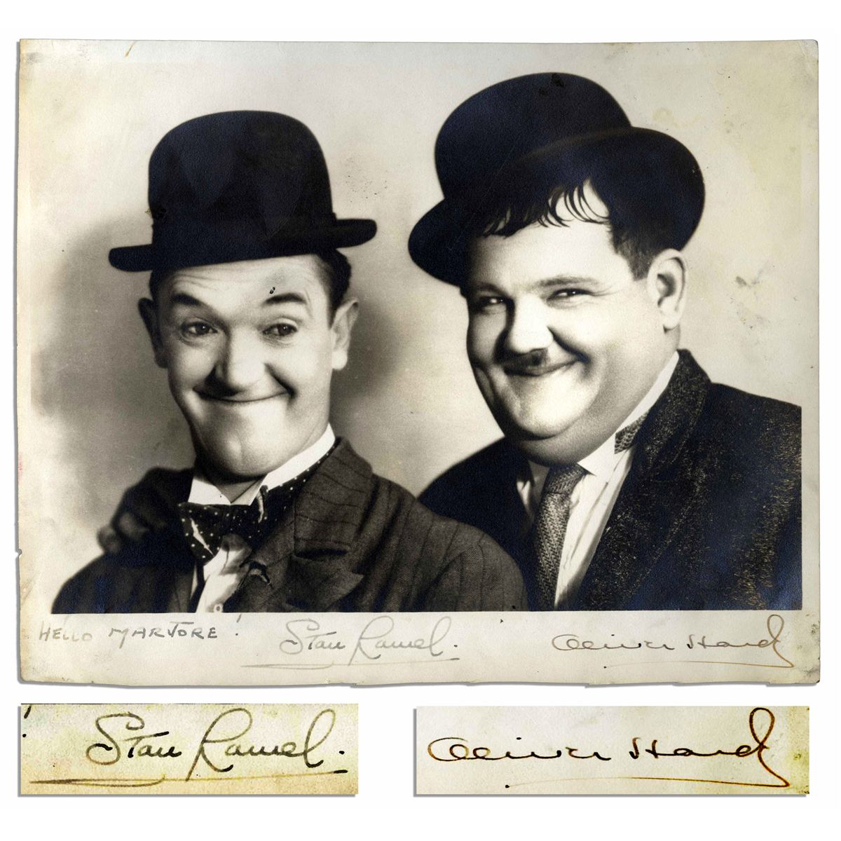 Stan Laurel and Oliver Hardy signed 9.75'' x 7.75'' sepia matte-finish photo. Stan and Ollie, who teamed up in the 1920's and made comedies together for twenty years, sign: ''Hello Marjore! Stan Laurel / Oliver Hardy''. Moderate soiling, creasing and paste residue, else very good. With JSA COA.
