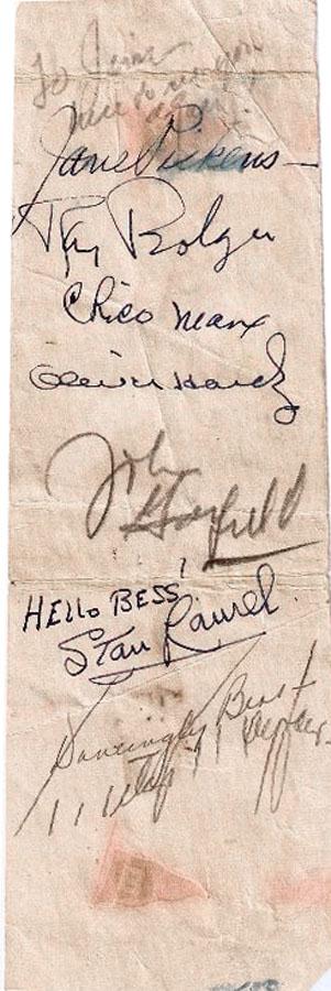 Autographs of Stan Laurel and Oliver Hardy, along with other stars of the day: Ray Bolger, Chico Marx, John Garfield, Jane Pickens and Mitzi Mayfair. All signatures are bold and readable. Water damage to top portion, primarily affecting Pickens' signature, smudging and creasing; overall fair to good condition. With JSA COA.