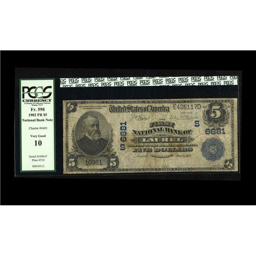 <B>Laurel, MS</B></I> - $5 1902 Plain Back Fr. 598 <B>The First NB</B></I> Ch. #(S)6681<BR>This elusive Jones County Plain Back has been certified as <B>PCGS Very Good 10.</B></I> We expect it to sell for about...