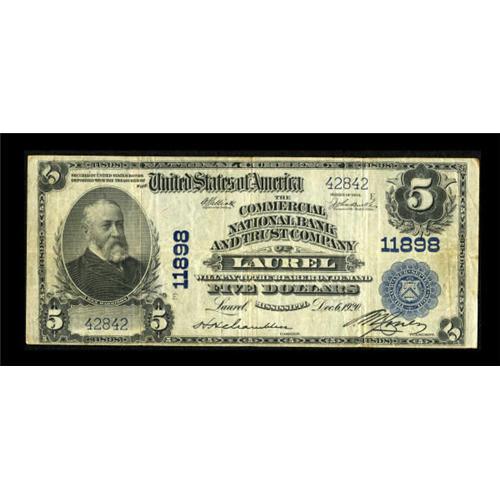 <B>Laurel, MS</B></I> - $5 1902 Plain Back Fr. 607 <B>The Commercial NB & TC</B></I> Ch. # 11898<BR> This was the only National Bank in Mississippi to issue entirely under a trust designation, lending an impressive appearance to their highly stacked title. Large examples are not terribly common, especially in decent grade, which this piece certainly is. Nice <B>Fine-Very Fine,</B></I> with engraved bank signatures. <BR><BR><b>Shipping:</b> Coins & Currency (<a target="_blank" href="http://www.heritageauctions.com/common/shipping.php">view shipping information</a>)