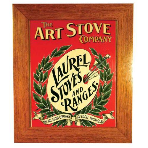 Laurel Stoves and Ranges, The Art Stove Company, Detroit, Michigan. Embossed tin sign in period oak frame. Some minor paint flaking from 1 to 3:00 otherwise excellent condition. 17 1/2 X 20 1/2 overall .