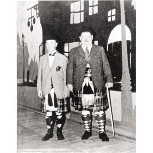 <B>Laurel and Hardy's Kilts and Accessories.</B></I> Wonderful Laurel & Hardy history! Stan and Ollie wore these kilts in a triumphant engagement at the Empire Theatre in Glasgow, Scotland in 1947. These kilts were created for Stan and Ollie in Glasgow; Laurel had brought the kilt he'd worn in <I>Bonnie Scotland</B></I> (1935) but opted to wear a new one after Hardy's size demanded a made-to-measure kilt. The green kilt, which Laurel wore in the film <I>Bonnie Scotland</B></I> was given to him by Harry Lauder -- the Scottish entertainer who was one of the biggest names in the history of music hall, on both sides of the Atlantic. The duo still wore the sporrans from <I>Bonnie Scotland.</B></I> This lot includes both kilts, both sporrans, both pairs of socks, and one pair of shoes. The costumes are still striking, in Very Fine condition. The history of the kilts can be found on the following web site http://members.aol.com/Lahbritishtours/landhmemo.html . <BR><BR><b>Shipping:</b> Miscellaneous Collectibles, Larg (<a target="_blank" href="http://www.heritageauctions.com/common/shipping.php">view shipping information</a>)