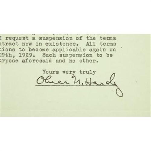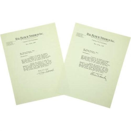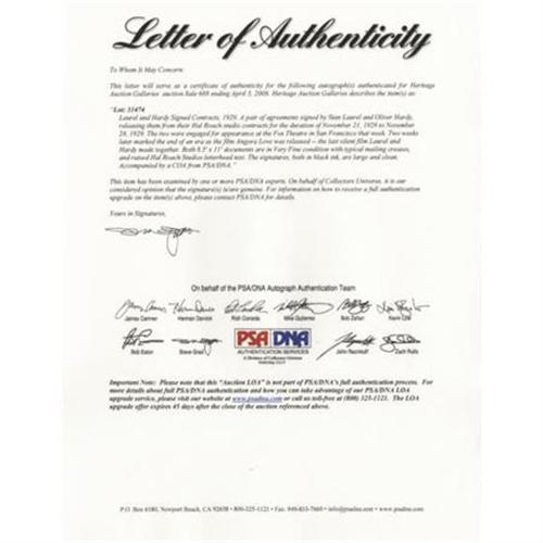 <B>Laurel and Hardy Signed Contracts, 1929.</B></I> A pair of agreements signed by Stan Laurel and Oliver Hardy, releasing them from their Hal Roach studio contracts for the duration of November 21, 1929 to November 28, 1929. The two were engaged for appearance at the Fox Theatre in San Francisco that week. Two weeks later marked the end of an era as the film <I>Angora Love</B></I> was released -- the last silent film Laurel and Hardy made together. Both 8.5" x 11" documents are in Very Fine condition with typical mailing creases, and raised Hal Roach Studios letterhead text. The signatures, both in black ink, are large and clean. <I>Accompanied by a COA from PSA/DNA.</B></I><BR><BR><b>Shipping:</b> Flat Material, Small (<a target="_blank" href="http://www.heritageauctions.com/common/shipping.php">view shipping information</a>)
