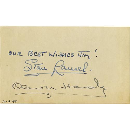 <B>Laurel and Hardy Signed Notecard.</B></I> A 3" x 5" notecard inscribed "Our best wishes Jim!" and signed by the comedic duo. In Excellent condition with light overall tanning. <I>With COA from PSA/DNA.</B></I>