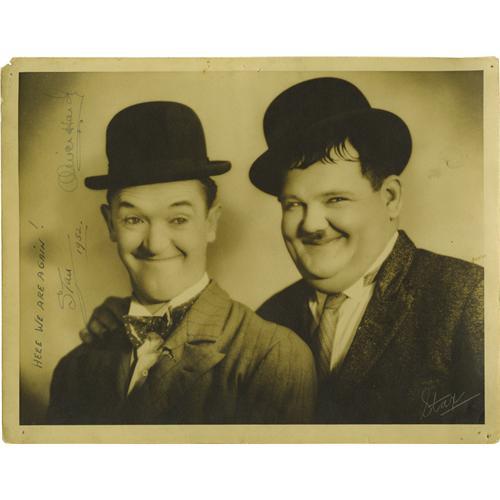 <B>Laurel and Hardy Signed Photo.</B></I> They ranked as the #7 all-time greatest comedy act ever (and highest rated comedy duo) in the 2005 Comedian's Comedian poll, and the number of classic short and feature-length films that Stan Laurel and Oliver Hardy starred in throughout the silent and early sound eras is enormous. This sepia-toned 11" x 14" b&w photo was taken by Stax Graves, the official Hal Roach Studio's photographer who took many portrait shots of Laurel and Hardy, and whose photos are much sought after by collectors. It is inscribed "Here we are again!" and signed by both Laurel (simply as "Stan") and Hardy, as well as by Graves in the lower right corner, and dated 1932. The photo is in very nice condition with a fair amount of tanning, minor soiling, no silvering, and worn corners with a tack hole in each. <I>With COA from PSA/DNA.</B></I>