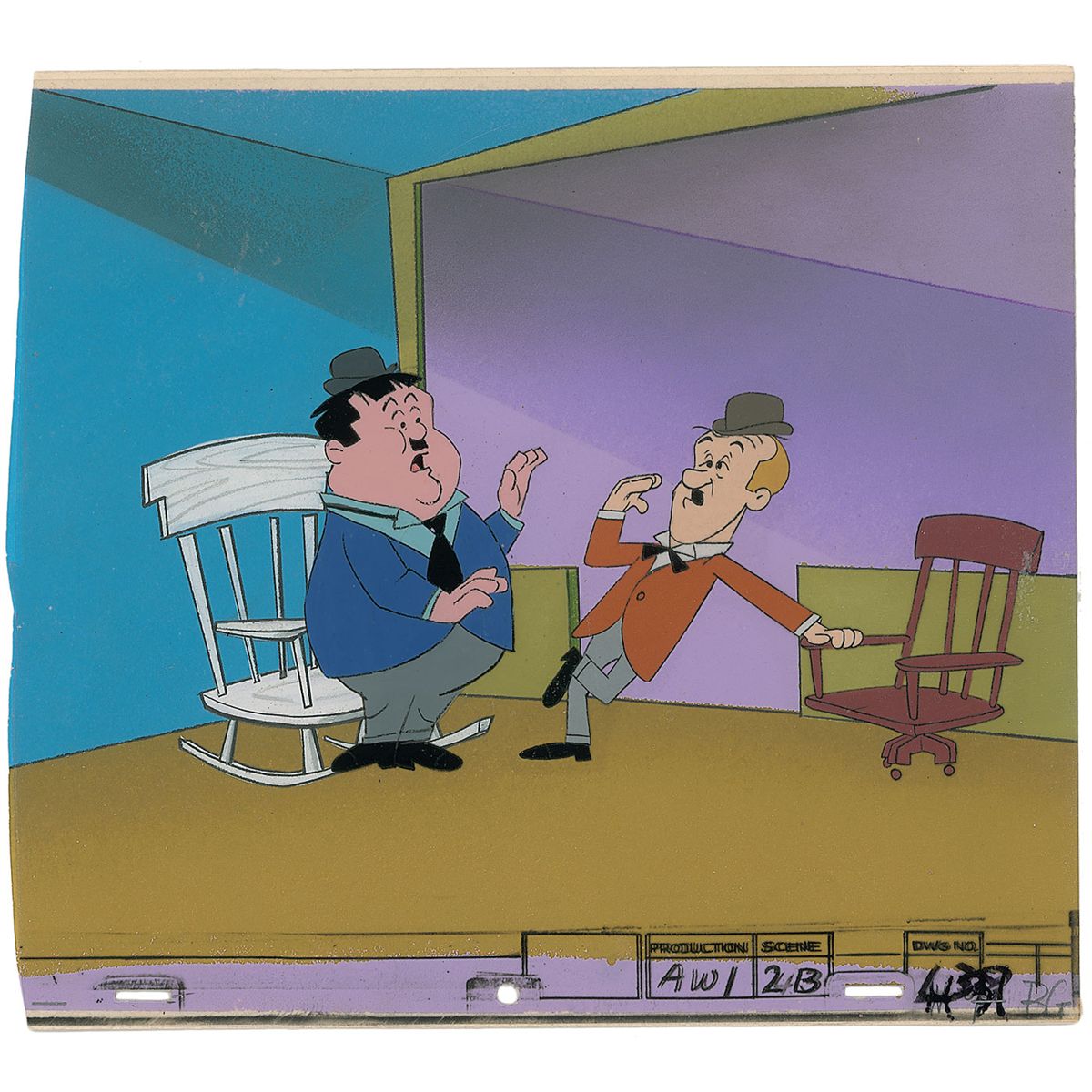 (Hanna-Barbera Studios, 1966) Original production cel and production background featuring Laurel and Hardy from The Laurel and Hardy Television Show. The cel is placed on a hand-painted production background. Hardy measures 2.5 x 5, Laurel measures 5.5 x 4.75, with overall dimensions of 11.75 x 10.25. Trimmed left edge, otherwise fine condition. Produced by Hanna-Barbera and originally airing in 1966, 156 shorts were made for the Laurel and Hardy animated program, with the voices done by Larry Harmon and Jim MacGeorge.