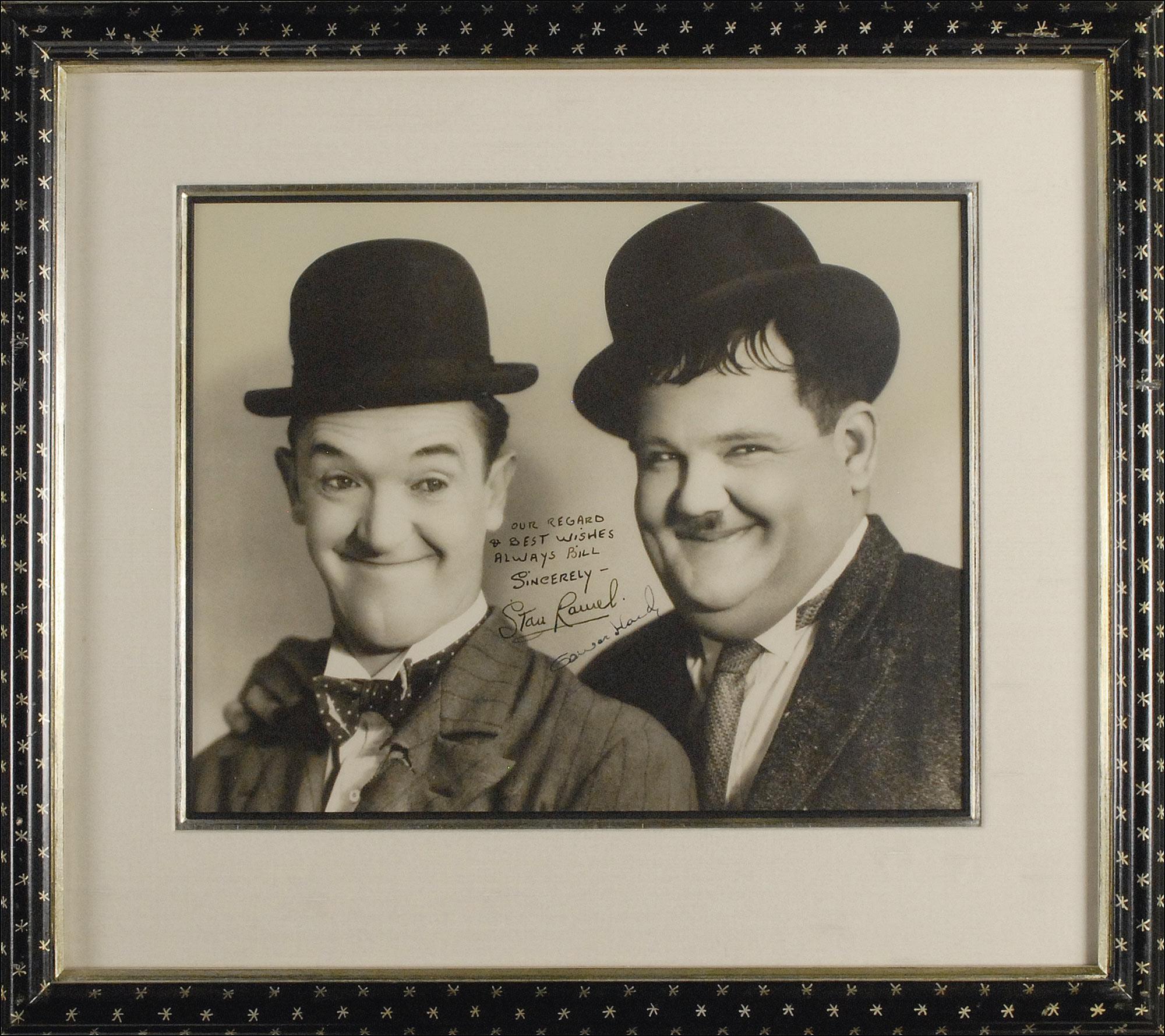 Choice vintage matte-finish 13 x 10.5 photo, signed and inscribed in fountain pen “Our regard & best wishes always Bill, Sincerely–Stan Laurel” and “Oliver Hardy.” Double cloth matted and framed to an overall size of 20 x 18. In fine condition, with a bit of scattered light silvering to darker areas of image. A superb example and one of the most impressive Laurel and Hardy photos you could ever hope to find!
