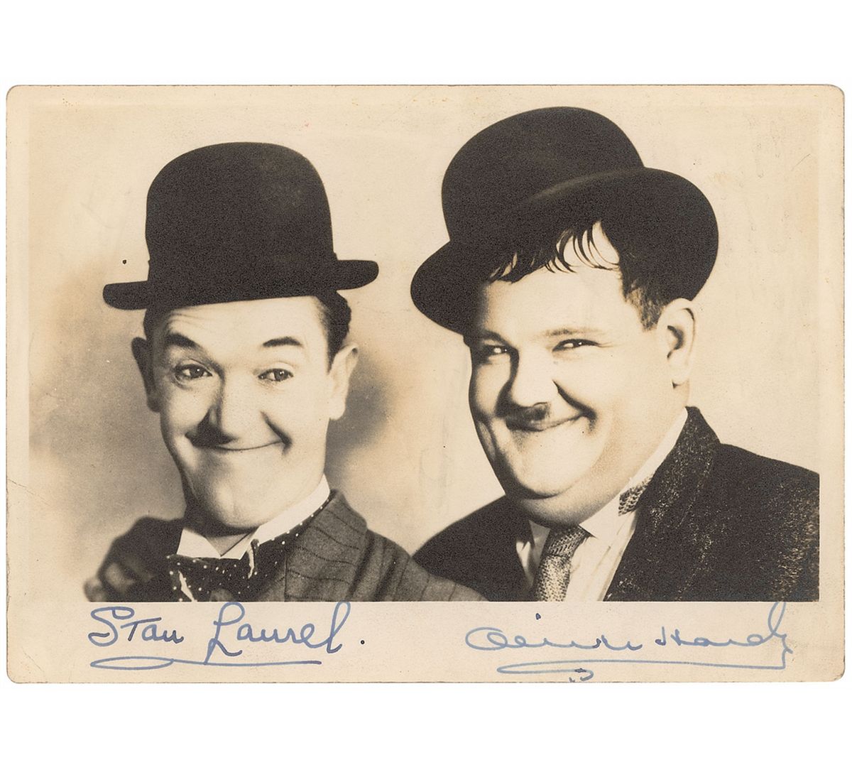 Vintage matte-finish 7 x 5 photo of the pair in their bowler hats, signed in the lower border in fountain pen, “Stan Laurel,” and “Oliver Hardy.” In very good condition, with some light corner and edge creases scattered silvering to darker areas, and light traces of removed notations to background.