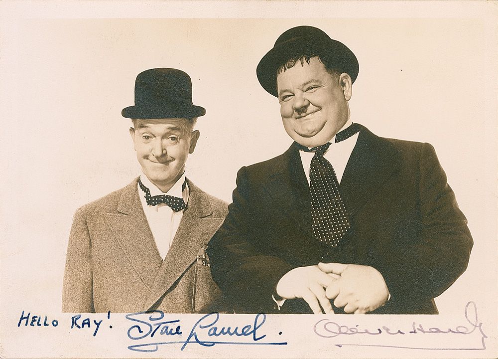 Vintage matte-finish 7 x 5 photo of the pair in suits and their bowler hats, signed and inscribed in fountain pen “Hello Ray! Stan Laurel,” and “Oliver Hardy.” In fine condition, with silvering to darker areas of image, visible only at an angle, and Hardy’s signature a shade or two lighter than Laurel’s, though Laurel’s remains exceptionally bold. Accompanied by the original Laurel and Hardy Feature Productions mailing envelope.
