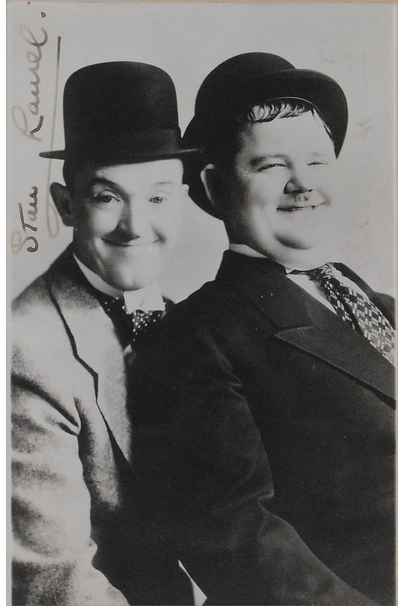 Vintage matte-finish 3.25 x 4.75 photo of the legendary comedy team side-by-side, signed vertically in fountain pen, “Stan Laurel,” and “Oliver Hardy.” Attractively double-matted and framed to an overall size of 9.25 x 11. In very good to fine condition, with Hardy’s signature heavily faded but portions visible. Uncommon in uninscribed examples.