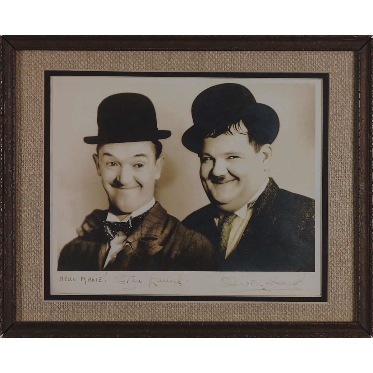 Desirable vintage matte-finish 9.5 x 7.75 photo of the comedic duo posing side-by-side in their bowler hats, signed and inscribed in the lower border in fountain pen, “Hello Marie! Stan Laurel” and “Oliver Hardy.” Double-matted and framed to an overall size of 13.5 x 11. Moderate silvering to dark areas of the image, otherwise fine condition.