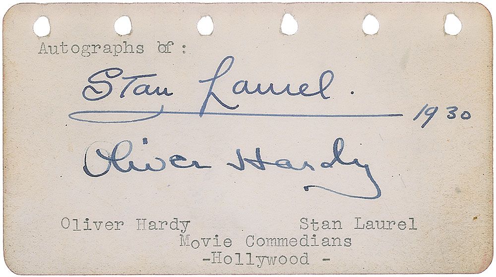 Vintage fountain pen signatures, “Stan Laurel 1930,” and “Oliver Hardy,” on an off-white 4.5 x 2.5 page. In fine condition, with a bit of light toning to lower right and a few wrinkles.