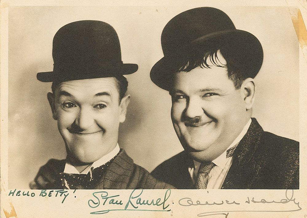 Vintage matte-finish 7 x 5 photo of the the comedic duo posing side-by-side in their bowler hats, signed and inscribed in the lower border in fountain pen, “Hello Betty! Stan Laurel,” and “Oliver Hardy.” Tape remnants to two corners and a couple tack holes to upper and lower edges (none affecting the signatures or image), otherwise fine condition.
