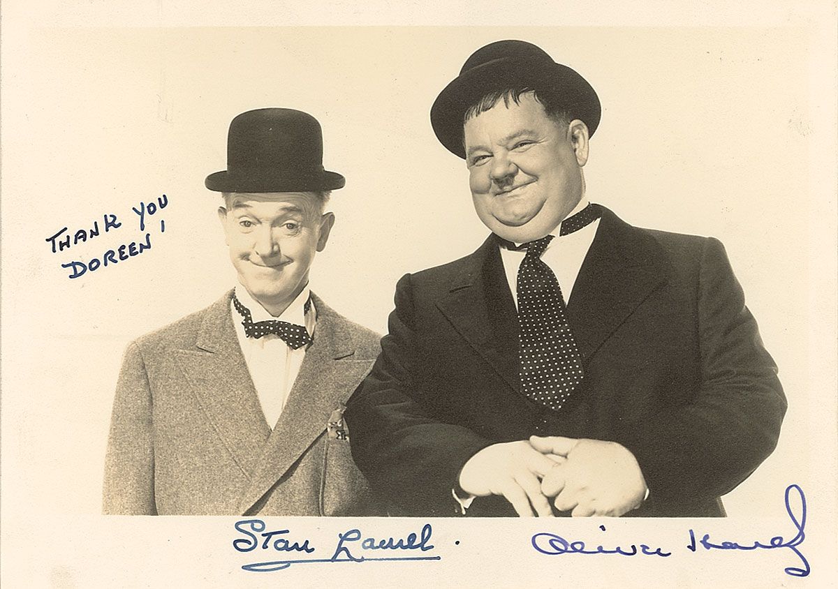 Choice vintage matte-finish 7 x 5 photo of the comedic duo posing side-by-side in their bowler hats, signed and inscribed in fountain pen, “Thank you Doreen! Stan Laurel,” and “Oliver Hardy.” In fine, clean, bright condition.