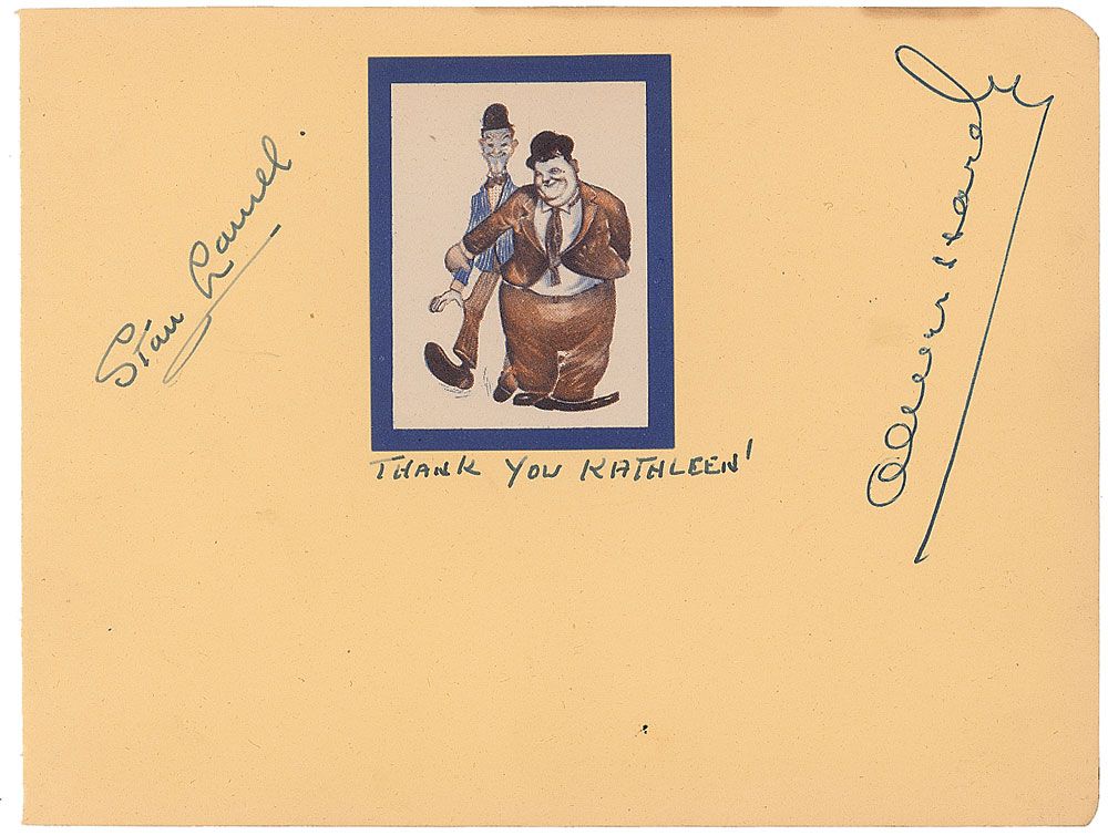 Vintage fountain pen signature and inscription, “Thank you Kathleen! Stan Laurel,” and a ballpoint signature, “Oliver Hardy,” on an off-white 6 x 4.75 album page, with a small color caricature of the pair affixed near the top of the page. In fine condition.