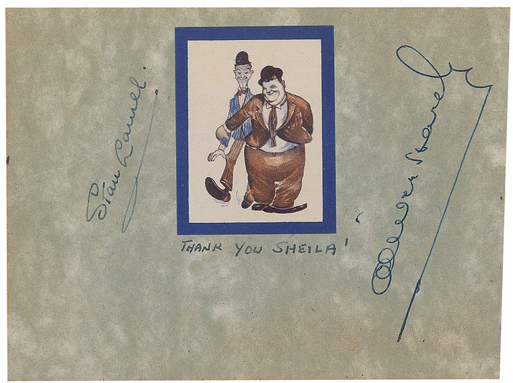 Vintage fountain pen signature and inscription, “Thank you Sheila! Stan Laurel,” and a ballpoint signature, “Oliver Hardy,” on a gray-and-white marbled 5.25 x 4 album page, with a small color caricature of the pair affixed near the top of the page. In fine condition.