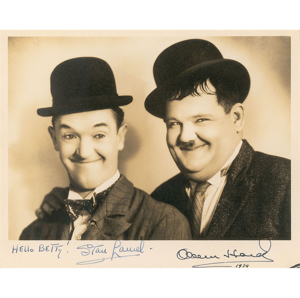 Fabulous and charming matte-finish 10 x 8 photo of the comedic duo posing side-by-side in their bowler hats, signed and inscribed in fountain pen, “Hello Berry! Stan Laurel,” and “Oliver Hardy 1934.” Reverse bears a collector’s pencil notation, “Auckland, Feb. 1934.” In fine condition, with a trivial mounting remnant to lower right corner tip.