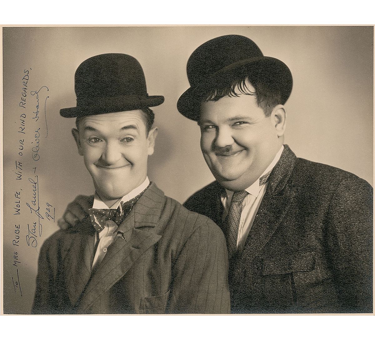 Classic vintage matte-finish 13.5 x 10.5 photo of the renowned comedic duo posing side-by-side in their bowler hats, signed and inscribed vertically in fountain pen, “To Mrs. Rube Wolfe, with our kind regards, Stan Laurel, 1929” and “Oliver Hardy.” Reverse bears a Stax photographer’s stamp. In fine condition, with slightly trimmed edges. Easily one of the finest oversized portraits of Laurel and Hardy that we have encountered.