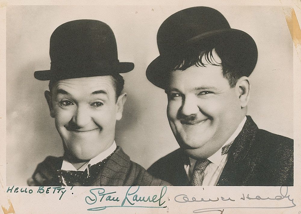 Vintage matte-finish 7 x 5 photo of the pair side-by-side in their trademark bowler hats, signed and inscribed in the lower border in fountain pen, “Hello Betty! Stan Laurel” and “Oliver Hardy.” Toned tape remnants to two corners and staple holes to top edge, otherwise fine condition.