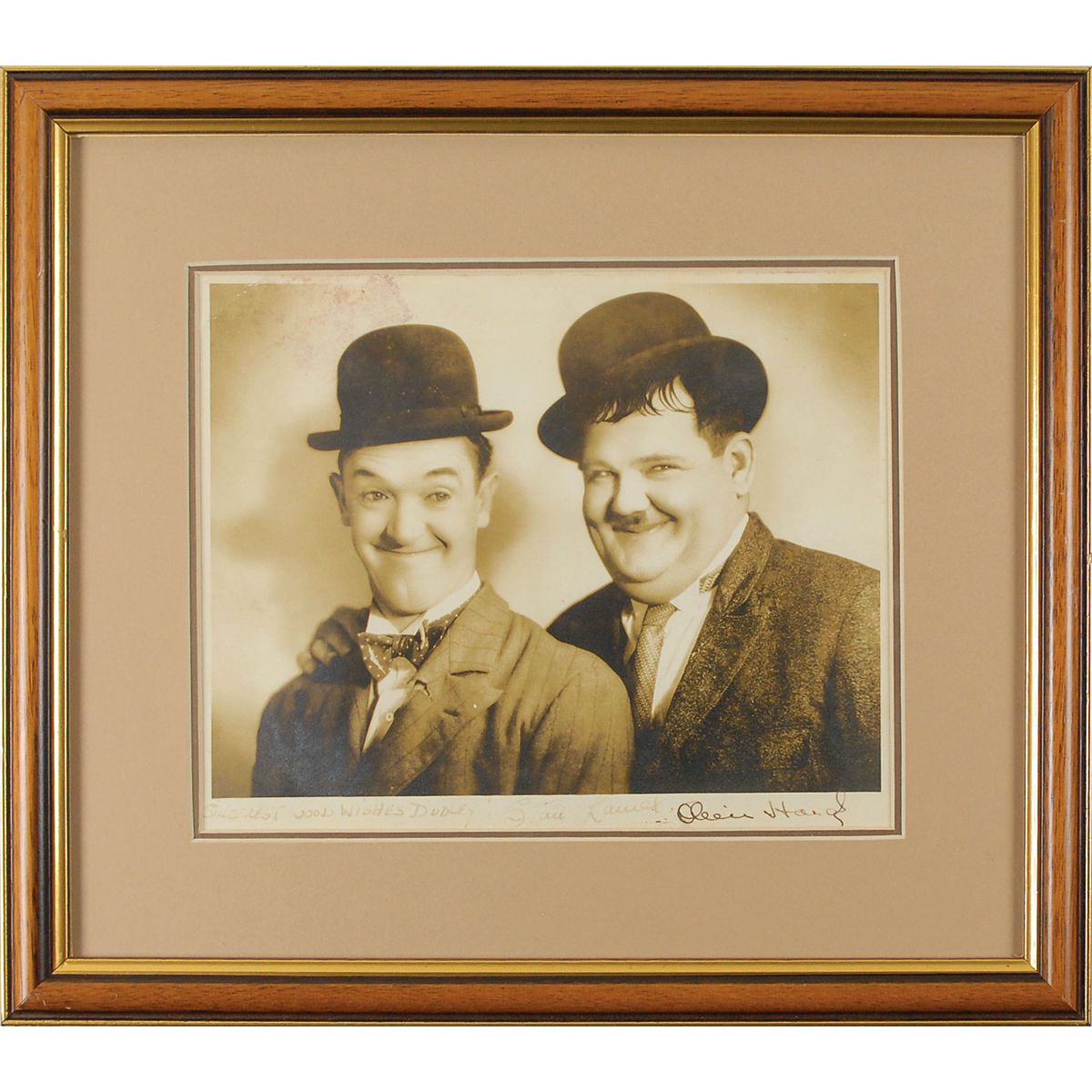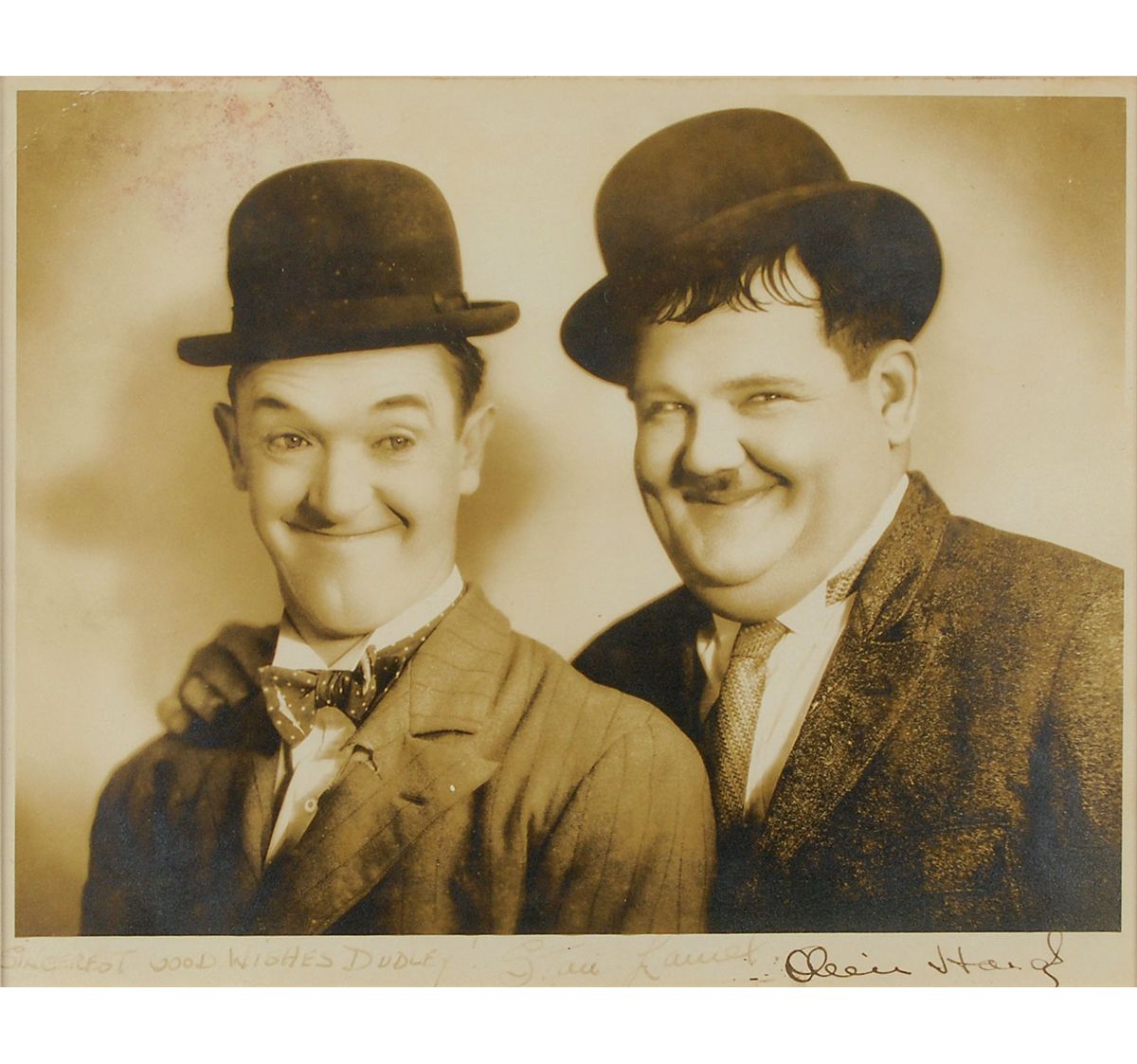 Vintage matte-finish 9.5 x 7.5 photo of the classic comedic duo posing side-by-side in their bowler hats, signed and inscribed in the lower border in fountain pen, “Sincerest good wishes Dudley! Stan Laurel” and “Oliver Hardy.” Double-matted and framed to an overall size of 15 x 13. In very good condition, with staining and creasing to upper left, Laurel’s signature and inscription noticeably faded, and a bit of silvering to dark areas of the image. Consignor notes that this was given to disc jockey Dudley Williams in 1933.