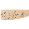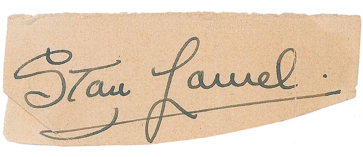 Bold pairing of fountain pen signatures of the classic comedy duo, “Stan Laurel” and “Oliver Hardy,” on individual 3.25 x 1.25 slips clipped from a larger page. A few vertical folds unobtrusively passing through letters in the signatures, overall toning, irregularly trimmed and closely cropped edges, and a crease to one corner of the Laurel slip, otherwise overall fine condition.