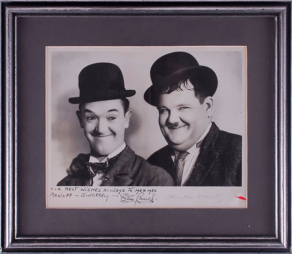 Vintage matte-finish 9.75 x 7.75 photo of the comedic duo posing side-by-side in their bowler hats, signed and inscribed in fountain pen, “Our best wishes always to Mr. & Mrs. Panoff—Sincerely—Stan Laurel” and in blue ink, “Oliver Hardy.” Matted and framed to an overall size of 14.25 x 12.5. In fine condition, with a stray red ink mark and soiling to lower right corner.