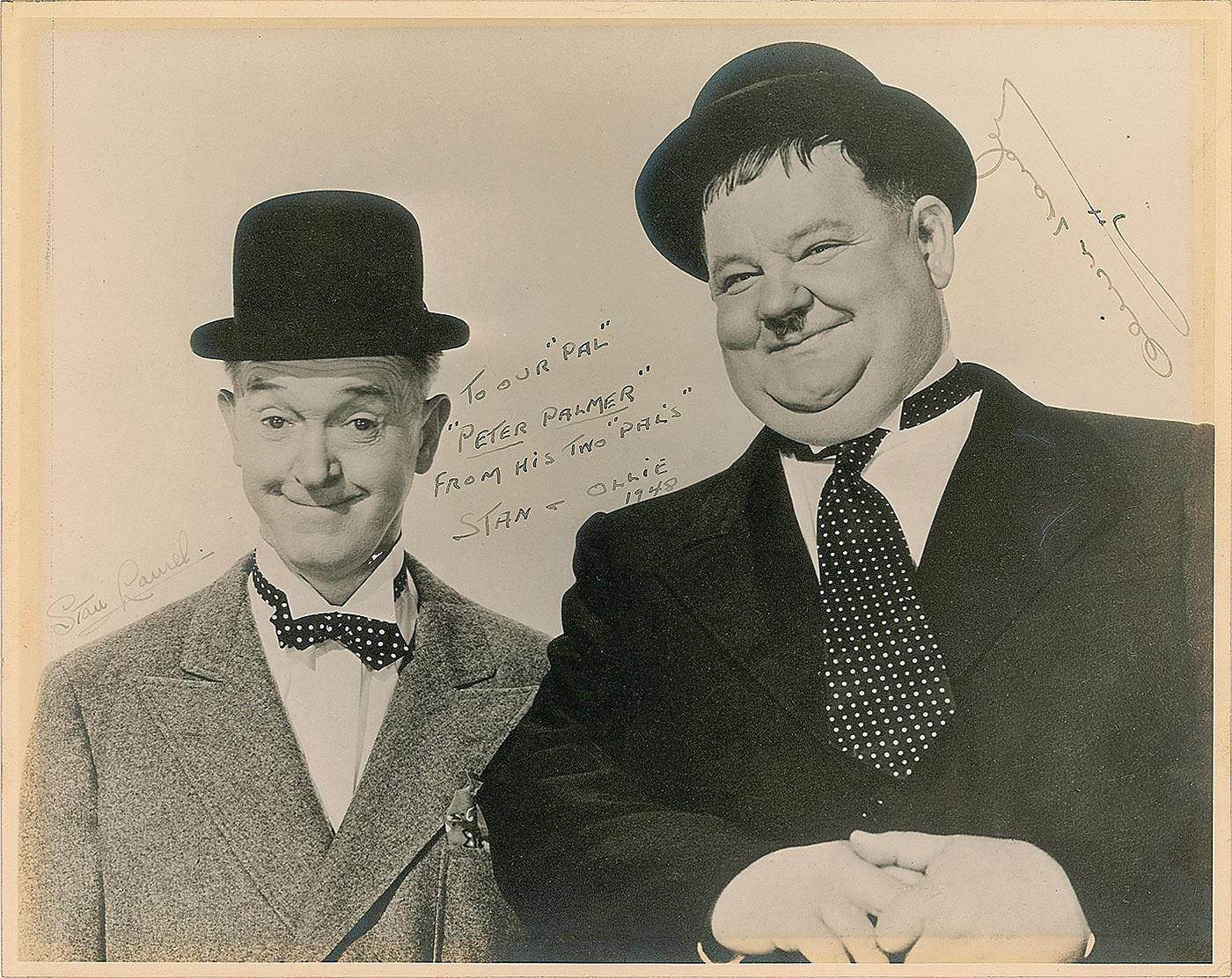 Vintage matte-finish 14 x 11 photo of the comedy duo side-by-side in their iconic bowler hats, signed and inscribed in fountain pen by Laurel, "To our 'Pal' 'Peter Palmer,' from his two 'Pal's,' Stan & Ollie, 1948,” and signed by Laurel on the left side, "Stan Laurel," and Hardy in the upper right, "Oliver Hardy." In very good to fine condition, with some light creasing and silvering, and toning to the perimeter from prior display. The recipient, Peter Parker, was an actor who became known for starring as Abner in the stage and screen productions of Li'l Abner. A scarce photo in this size, enhanced by its show business association.
