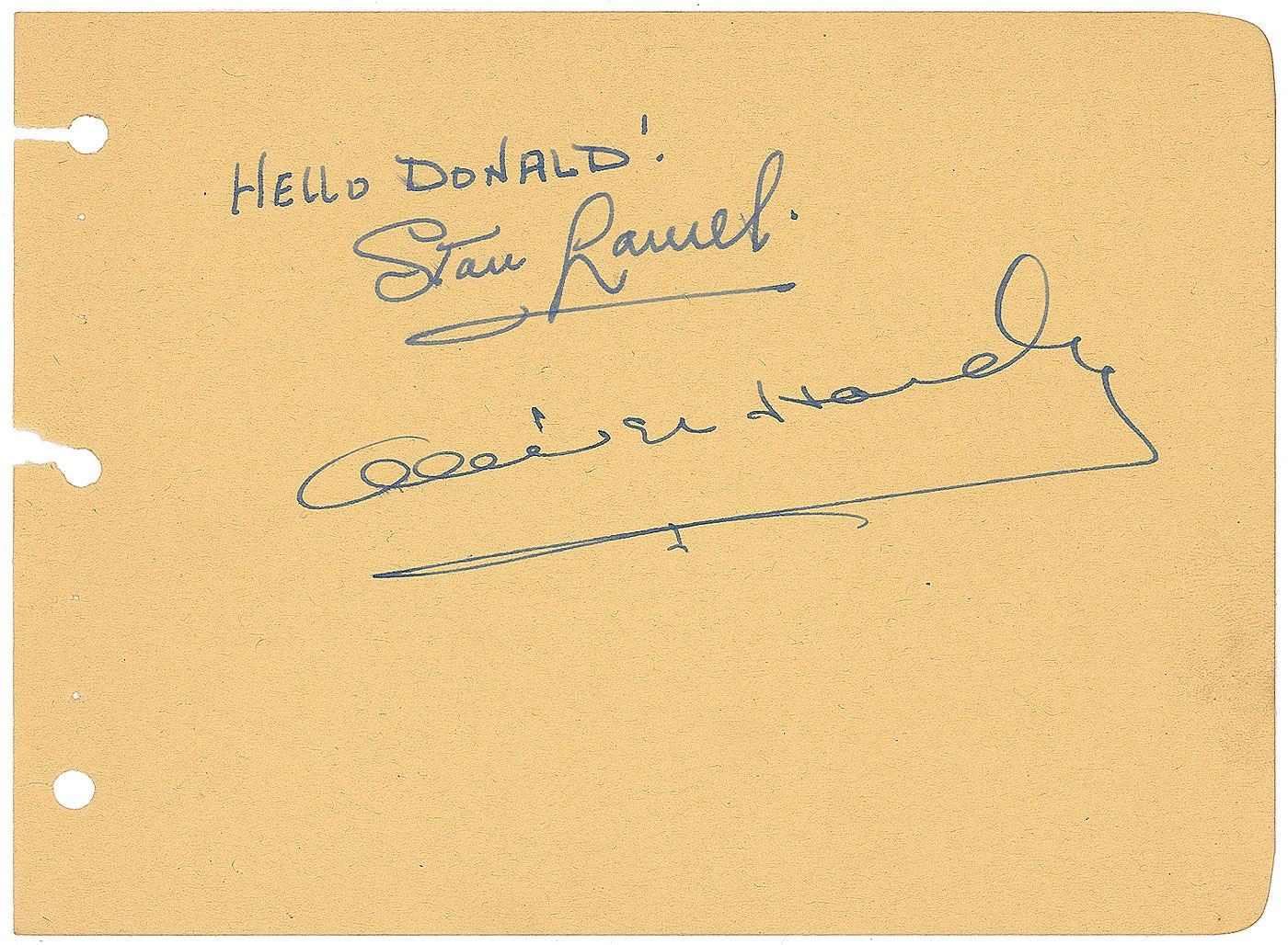 Vintage fountain pen signatures and inscription, "Hello Donald! Stan Laurel" and "Oliver Hardy,” on a yellow 6 x 4.25 album page. In fine condition.